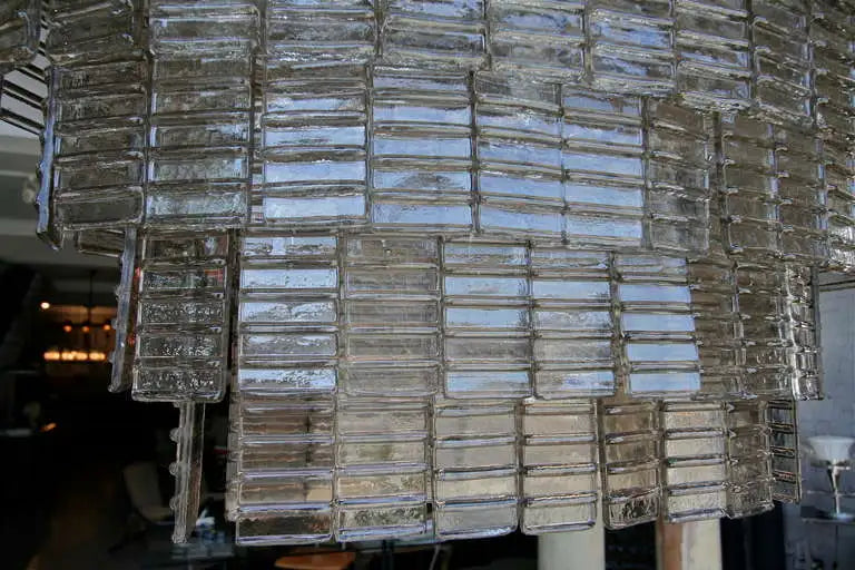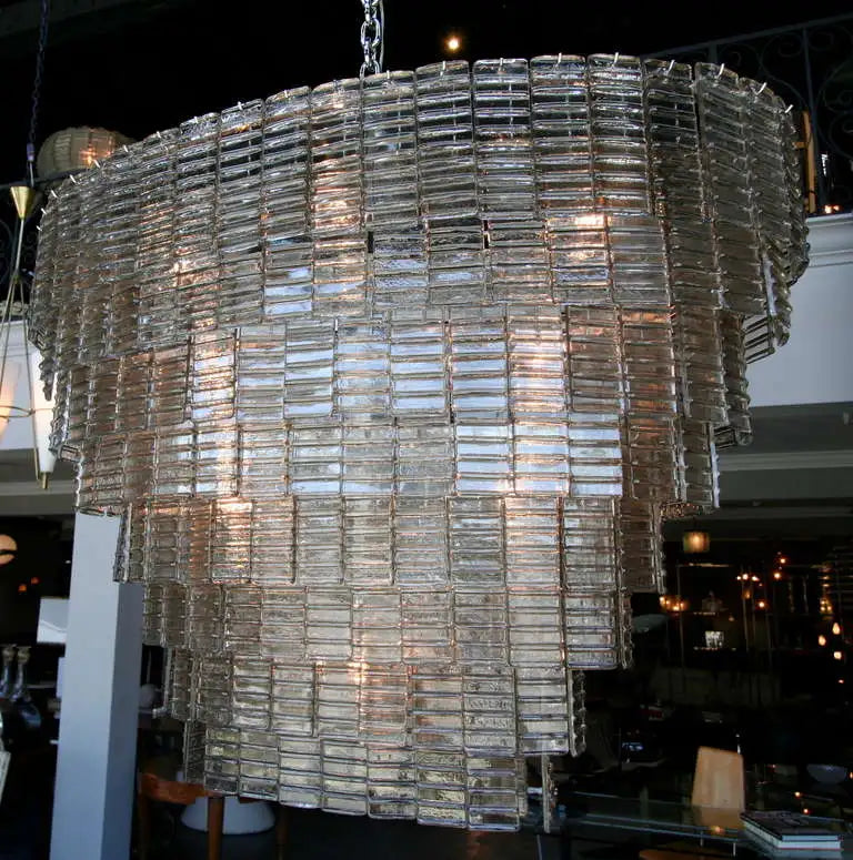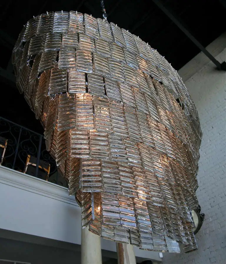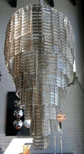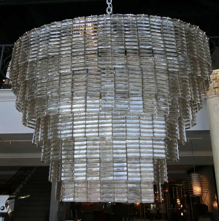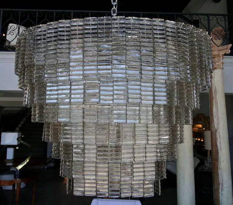 Large oval smoked glass Murano chandelier with eight tiers of rectangular glass and sixteen-light.