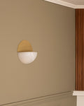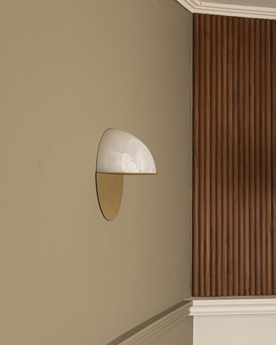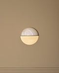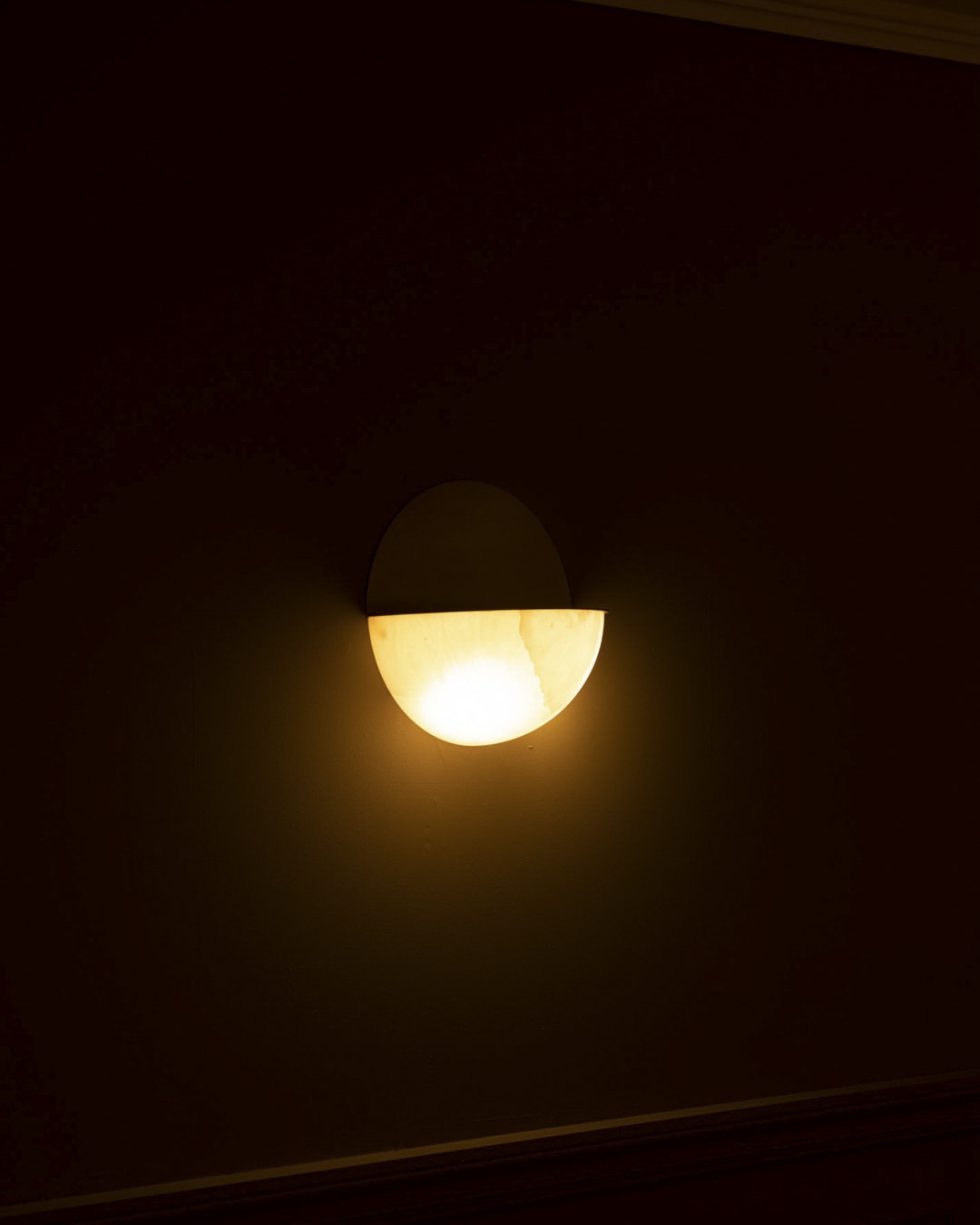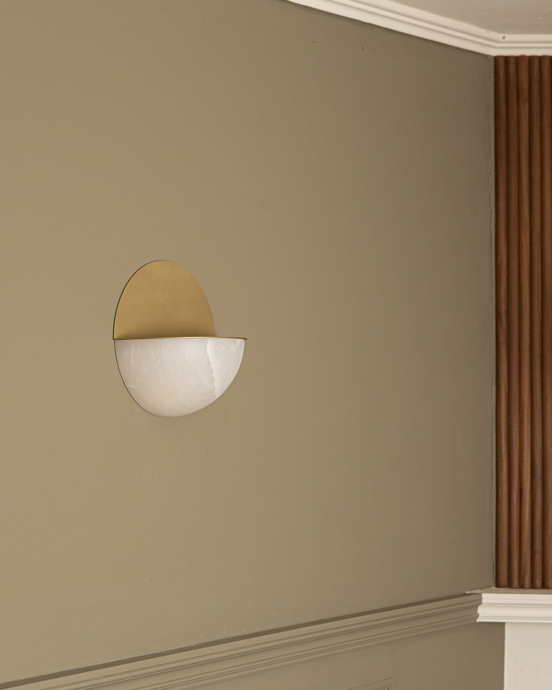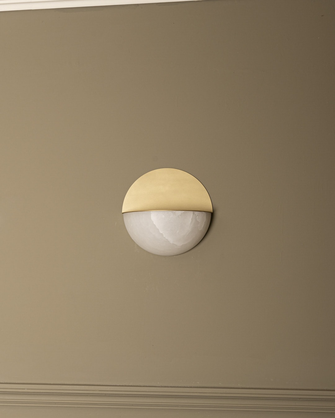 Made in Spain, the Luno alabaster wall light is a pure expression of curves and perspective. Designed by Simone & Marcel, this wall lamp composed of a spherical shade and a demi-circle brass plate. Depending on the position in which it will be placed, the wall light creates a different form. Facing north, the Luno's light reflects on the ceiling, facing south it creates a soft glow on the wall and floor. Being a natural material, the alabaster's tones and colours may vary from one room to another. For multiple wall lights, the designers select similar stones for a harmonious result.