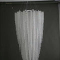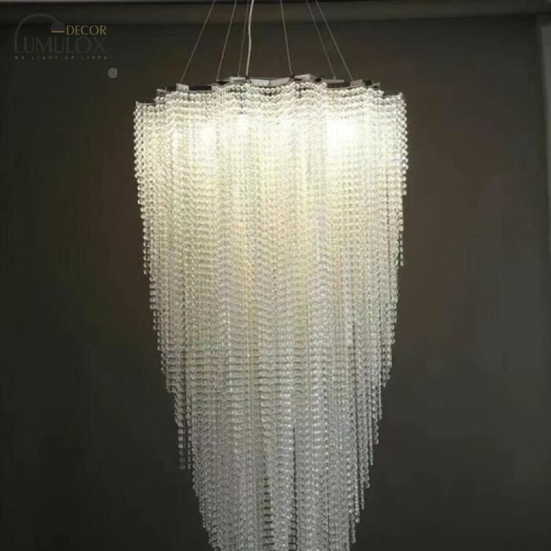Burj Italian crystal hanging chandelier shown in stainless steel and Swarovski crystals. Produced using Swarovski crystals to create one of a kind artwork, this collection uses classic artisan techniques to create various shapes and sizes. Made In Italy.