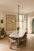 Featuring four stone globes, the Mobile Alabaster Chandelier by Contain studio is the centerpiece of any room. Handmade in Mallorca, Spain, the chandelier is composed of brass wrapped in rough leather (upon request). The height is customised according to your project needs.
