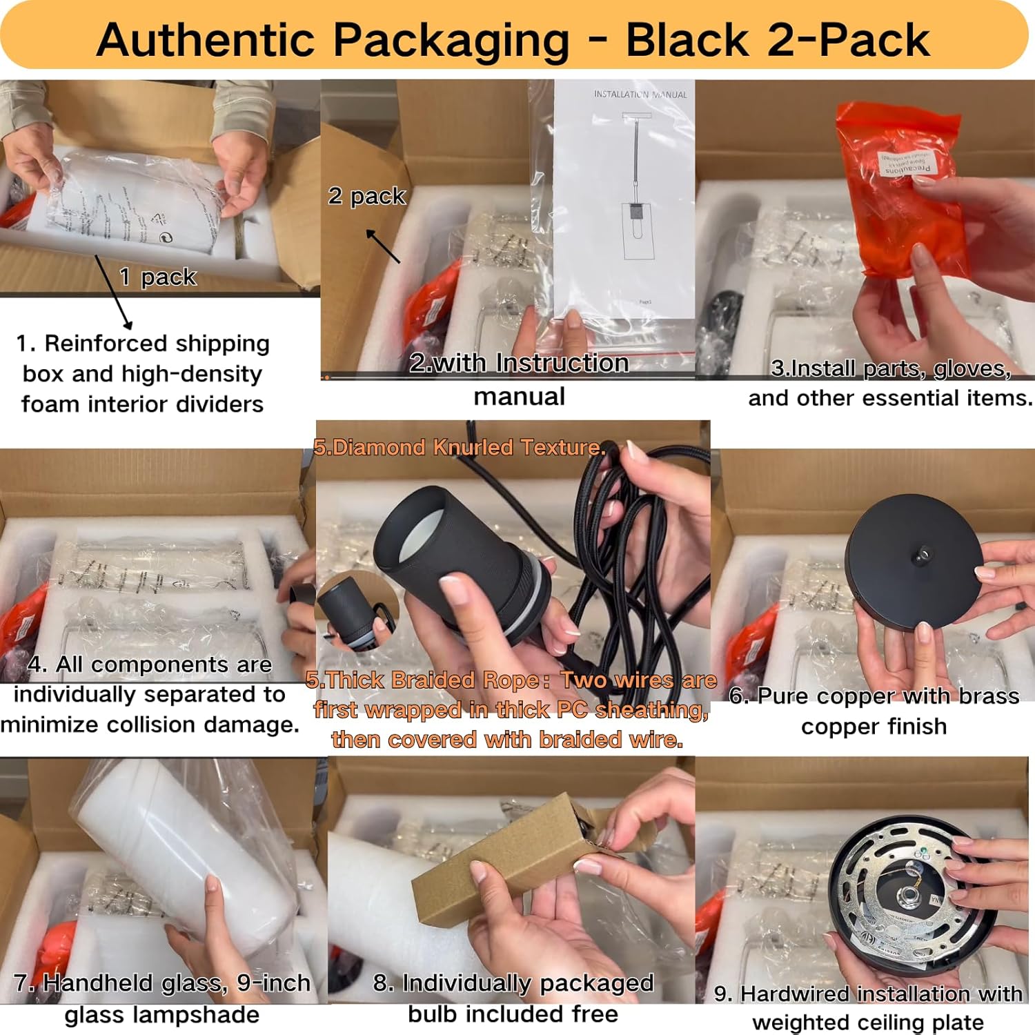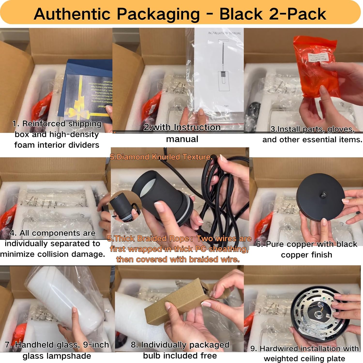 This pendant lights kitchen island features a thickened HD clear glass shade, finely crafted diamond knurled texture and excellent heat dissipation copper base with thick and durable 72-inch adjustable braided rope, the ceiling tray is compatible with all kinds of ceilings, which makes the beautiful and classic pendant light hanging from the ceiling safer and more stable.