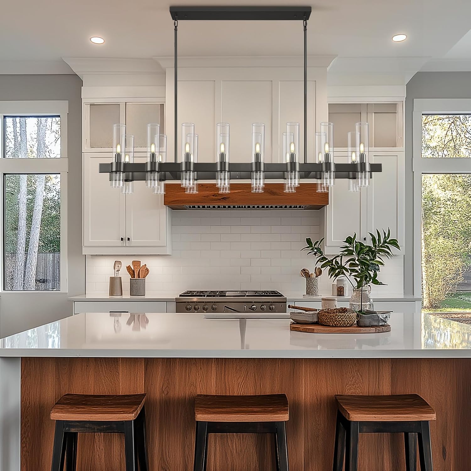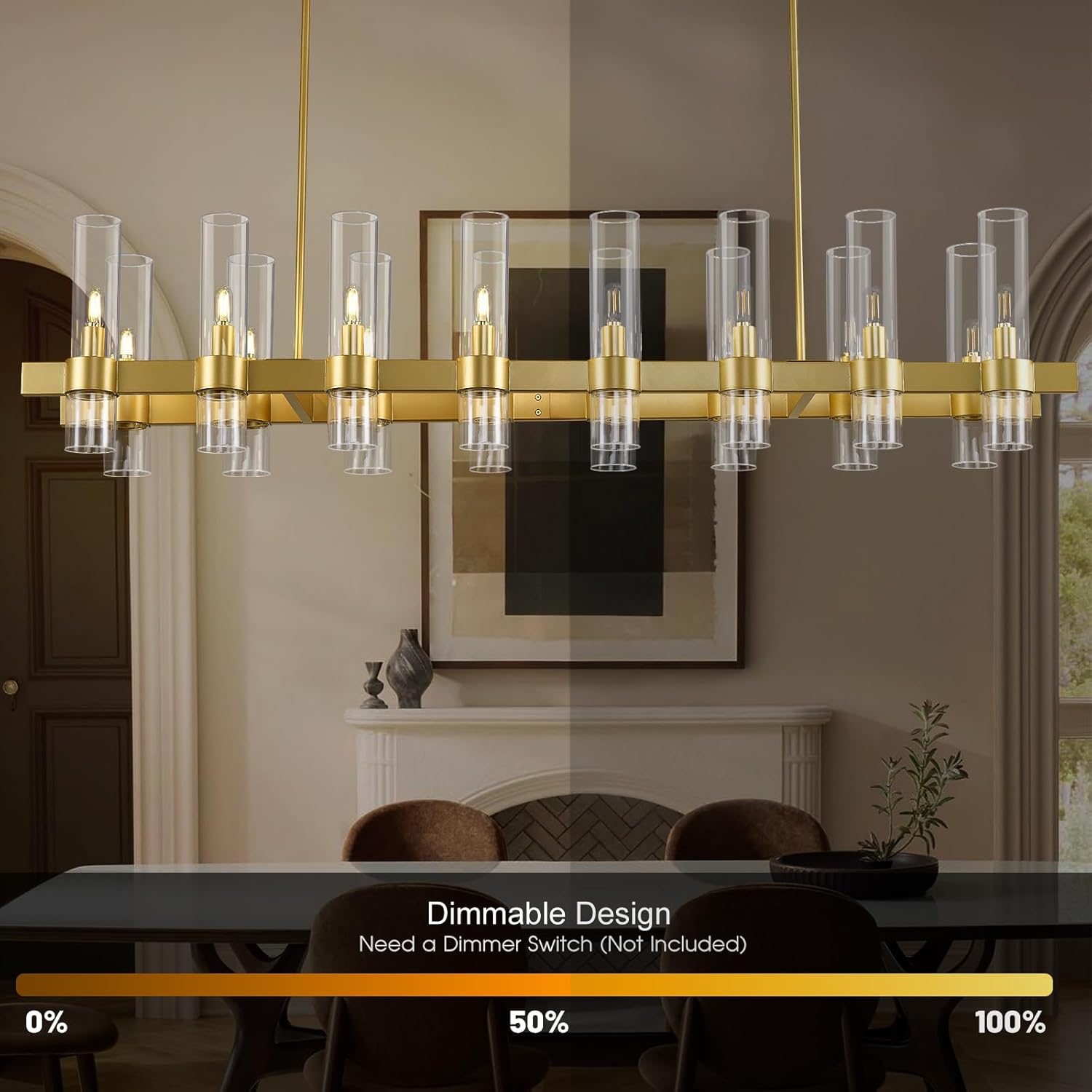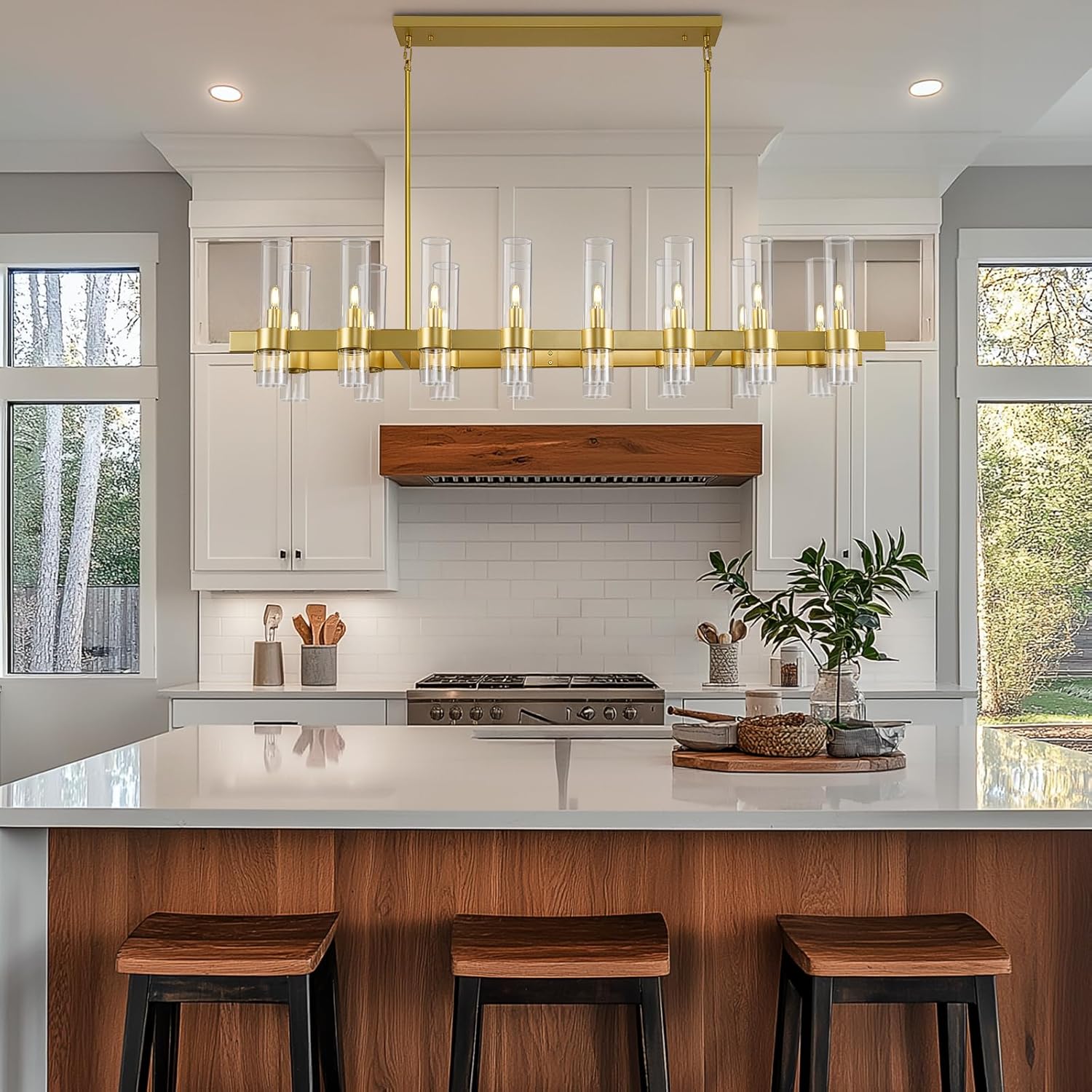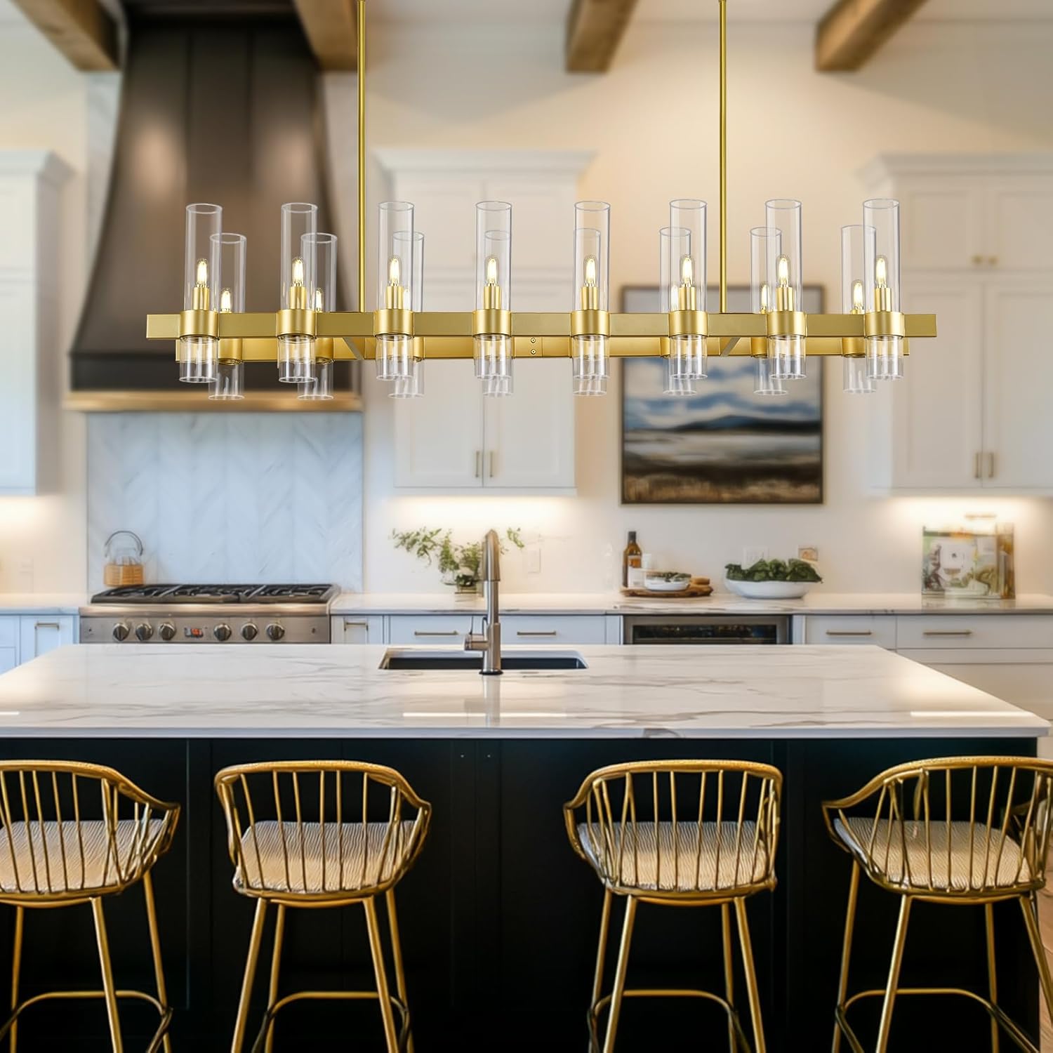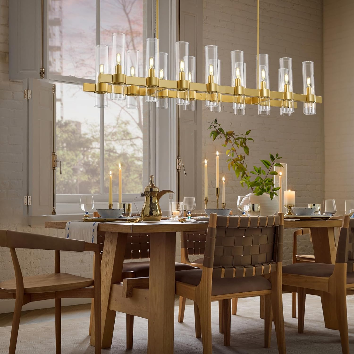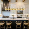 Brighten up your space with this stunning brass linear chandelier! This 16-light fixture offers adjustable height, perfect for adding a touch of modern farmhouse charm to your kitchen island or dining area. Its sleek design and ample illumination create an inviting ambiance, making every meal a delightful experience. Get ready for compliments galore with this eye-catching centerpiece.