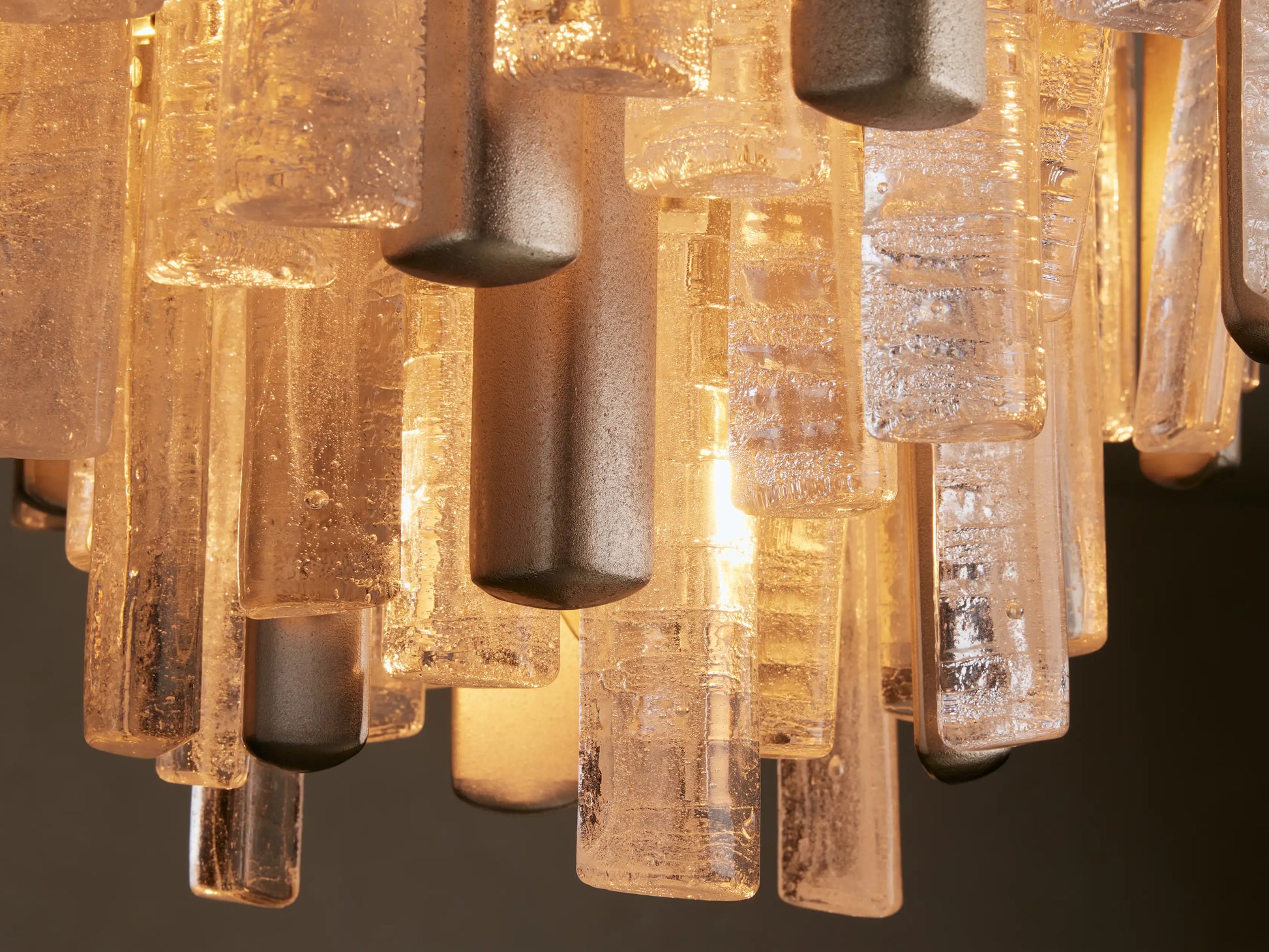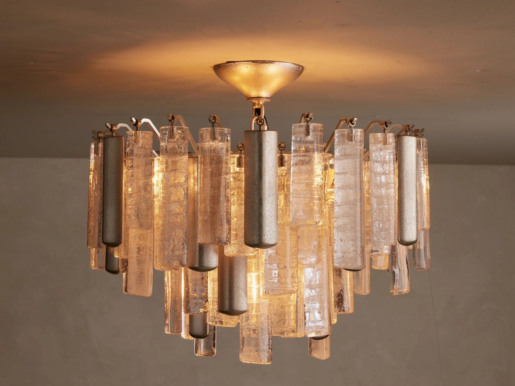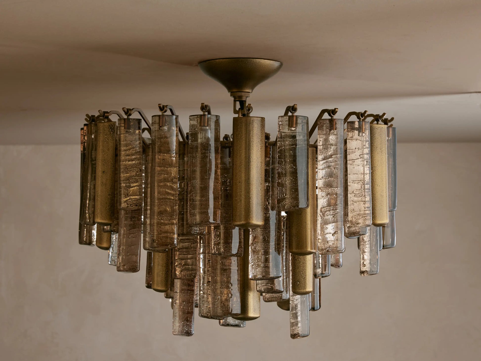 Inspired by traditional Italian Murano fixtures, our Neve Collection layers cast glass and metal into a richly textural, light-catching form. Offered in burnished brass with bronze glass or champagne silver with clear glass, each mixed-material piece glows with sculptural depth and artisanal character.