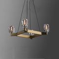 The Olga Square Chandelier is machined from solid brass. All parts are hand polished and patina'd. The lead crystal shades are hand polished.
