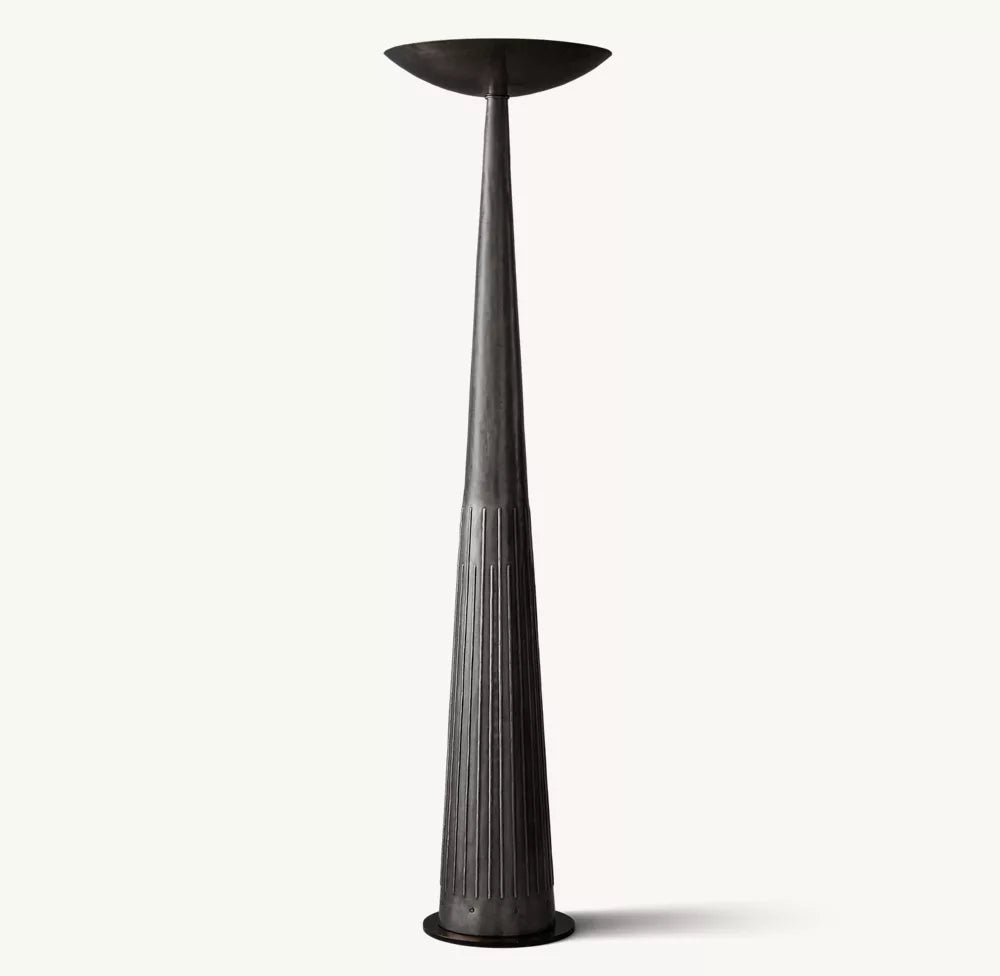 A study in proportion and balance, our reproduction of an Italian lamp celebrates the bold minimalist spirit of the 1950s. Subtly patterned at the base with rhythmic fluting, the elongated conical body extends dramatically upwards, culminating in a simple round reflector shade.