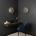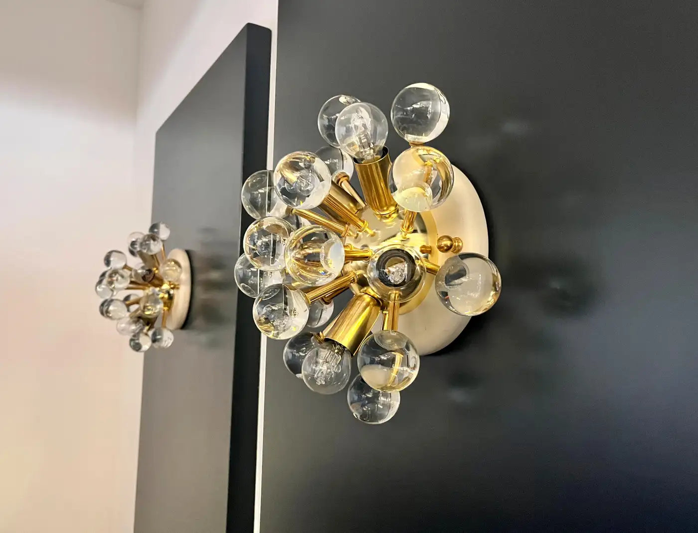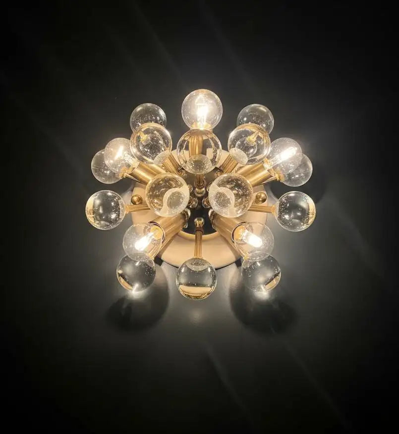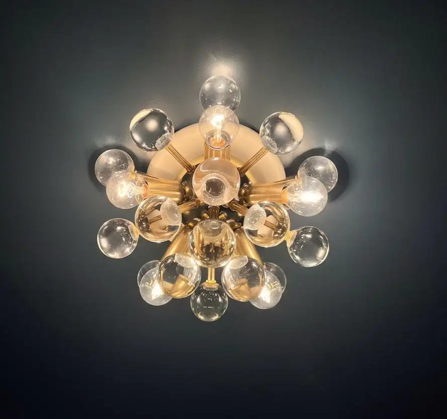 A pair of lighting fixtures, which can be either a wall lamp or a ceiling light, given their configuration; they feature a Sputnik/Mid-Century Modern design, characterized by a futuristic, ray-like aesthetic. Comprising a central circular structure in white or ivory, from which slender, polished brass arms radiate symmetrically, each arm culminating in a solid, transparent glass sphere, made of exceptionally high-quality glass.
