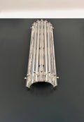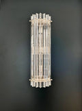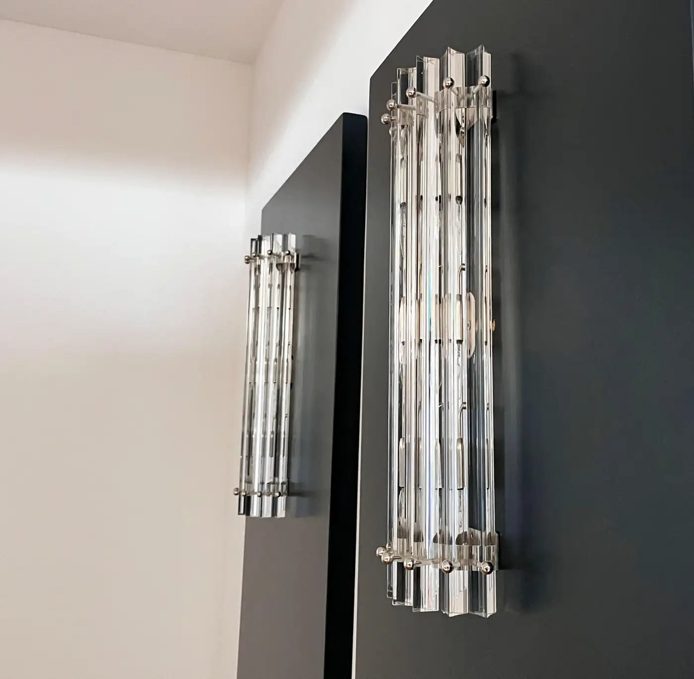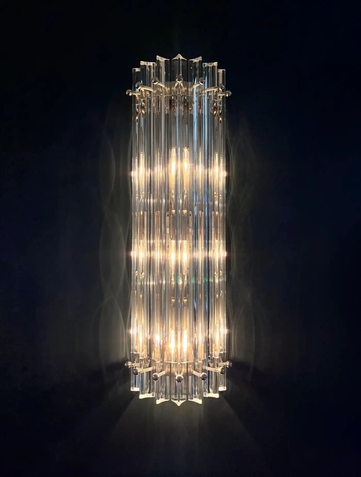 Fantastic pair of vintage Murano wall sconce made by 7 Murano crystal prism (triedri) for each applique in a chrome metal frame. The shape of this sconce is column. The glasses are trasparent. The wall lamps can be installed vertically, as photos, very beautiful even if installed horizontally.
