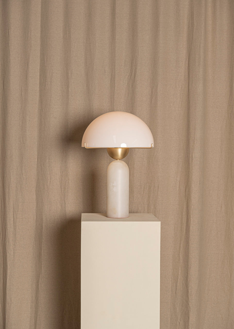 The Peono table lamp by Simone & Marcel combines spherical lines to create a bold silhouette. The alabaster base is topped by a solid brass half-sphere detail and contrasted with a smooth, acrylic dome. Enjoy the gentle diffusion of a soft, milky light emanating from this statement piece, adding elegance to any space.
