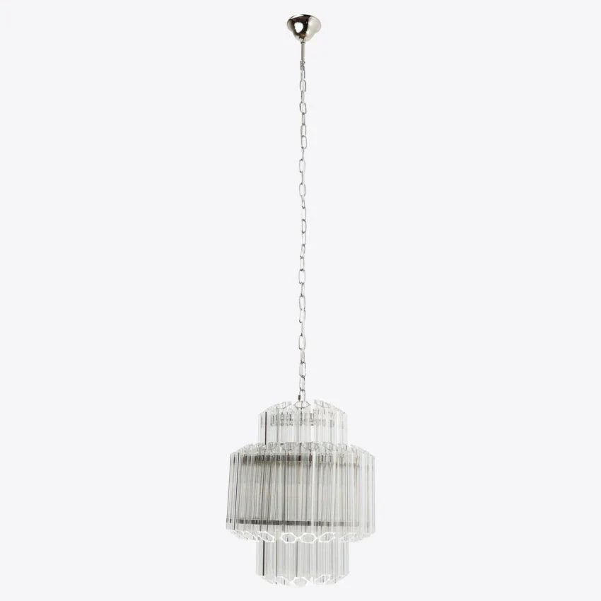 The stunning 1970s-inspired glass Palermo Chandelier features a chrome-plated iron frame, with hexagonal glass tubes elegantly suspended at each level in a diamond formation.
