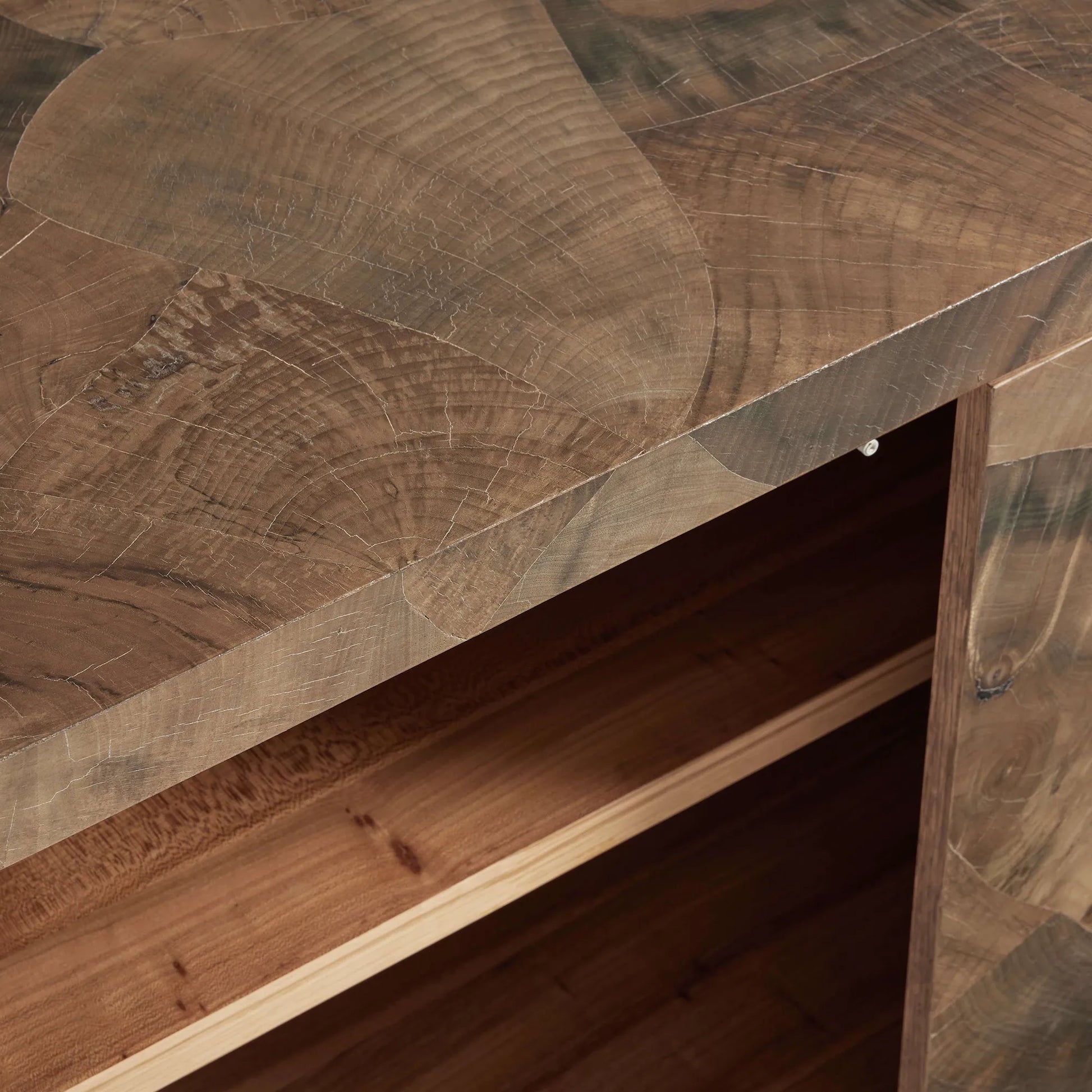 Set atop a base of naturally oxidized steel, left to weather and develop its own rich patina over time, this sideboard balances organic texture with industrial soul. A reactive hand-applied finish enhances the wood’s natural tones, followed by a protective acrylic lacquer to preserve its beauty. Inside, two adjustable and removable shelves and integrated cord management offer both form and function.