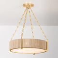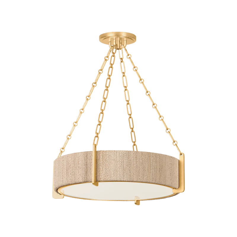 In a clever play on materiality, this sensory fixture transforms bleached Abaca rope into jewelry-like chains. The finely twisted ropes appear like delicate gold strands from afar but have a rustic quality that makes the fixture feel casual and coastal. Suspended by a thick Gold Leaf framework, Quebec is available in two sizes of chandelier as well as a sconce. The clear glass drum has been painted white for a soft, opaque effect that gently diffuses light.