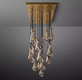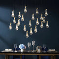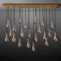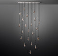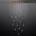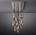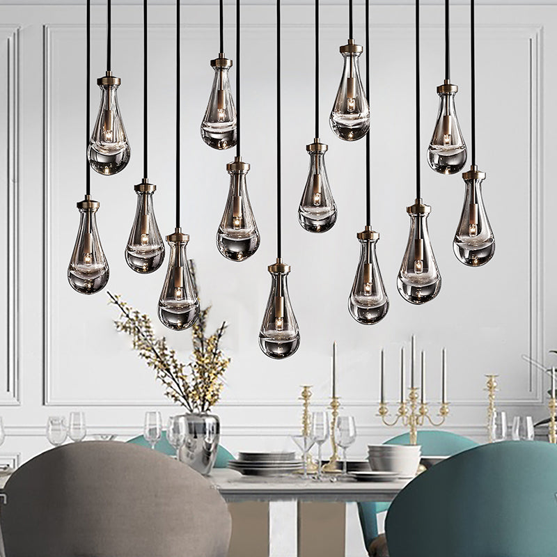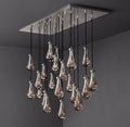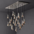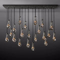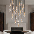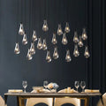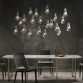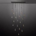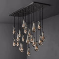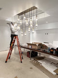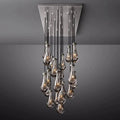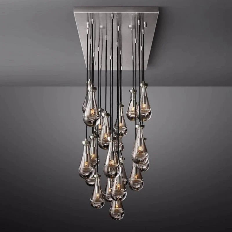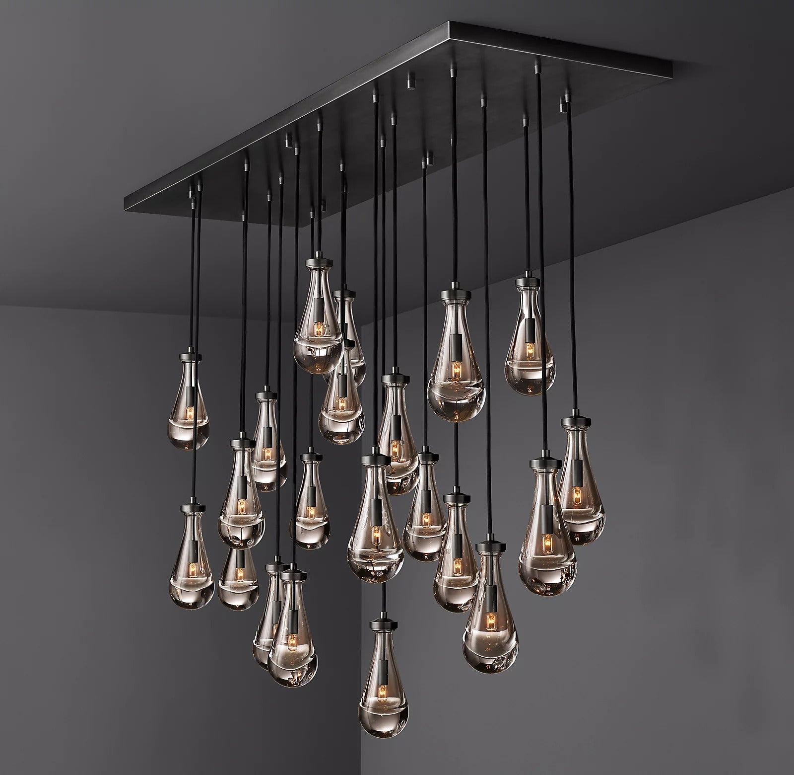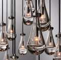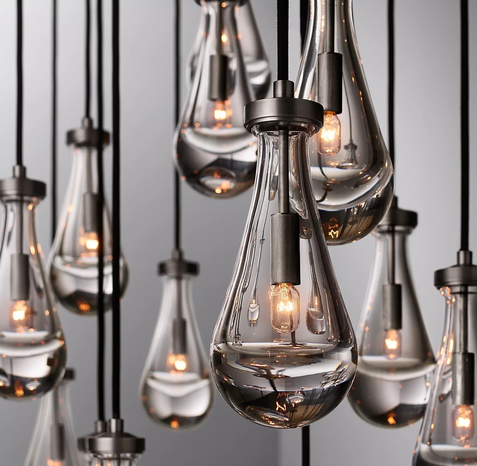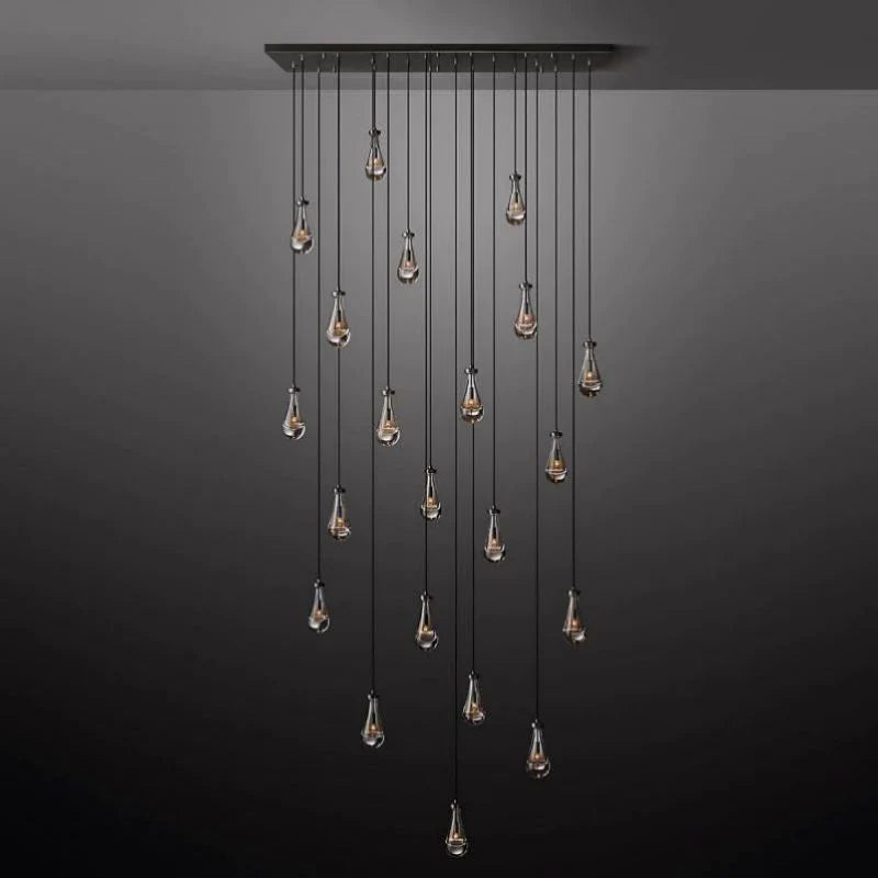 Raindrop Chandelier engages the viewer in an ever-changing pattern of expansion and compression - much like the rhythm of a rainstorm itself. Suspended on slender black ropes, blown glass drops wrap around the bulbs - creating the illusion of underwater illumination - and cast glowing ripples that wash over the ceiling and walls.