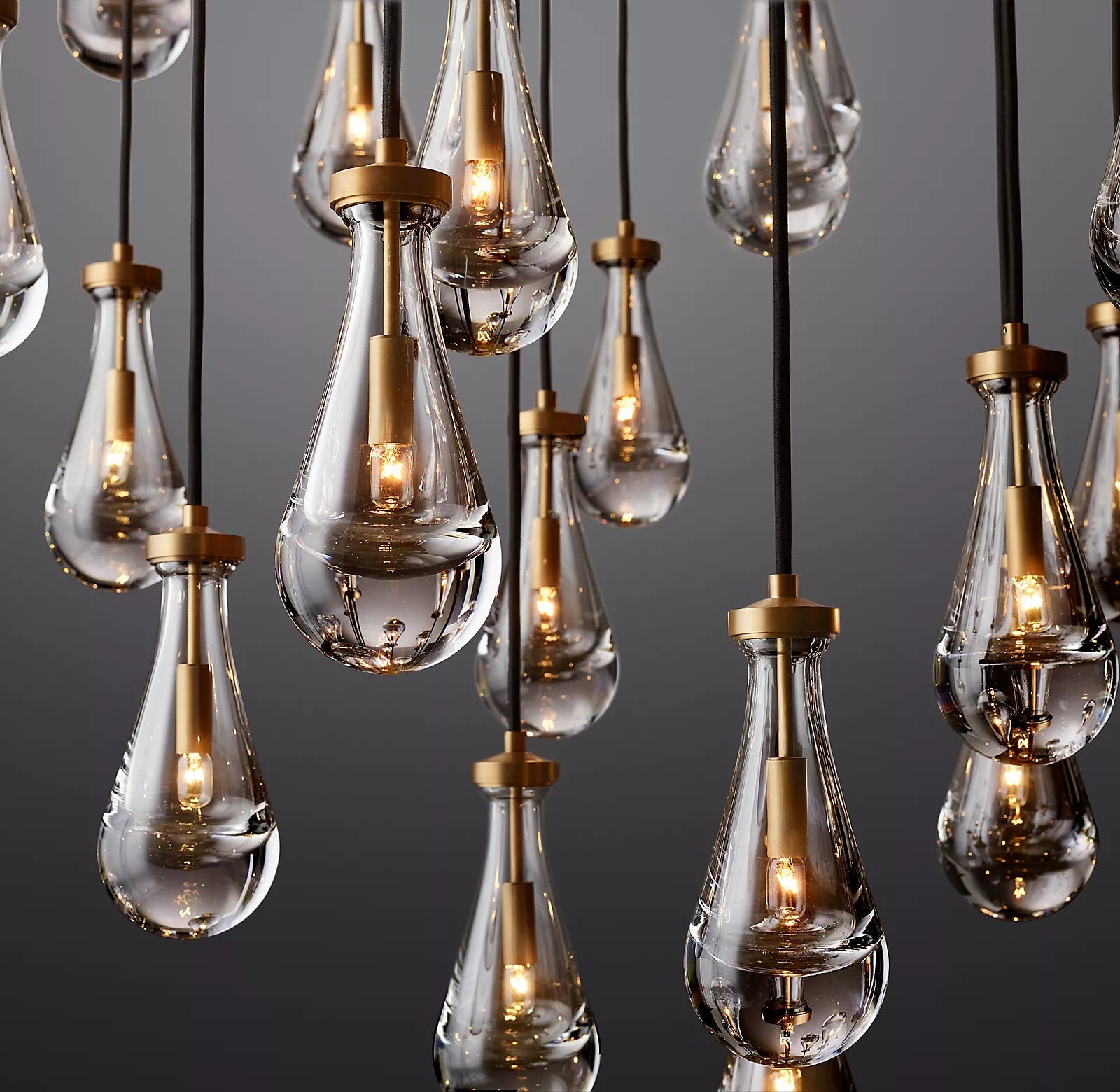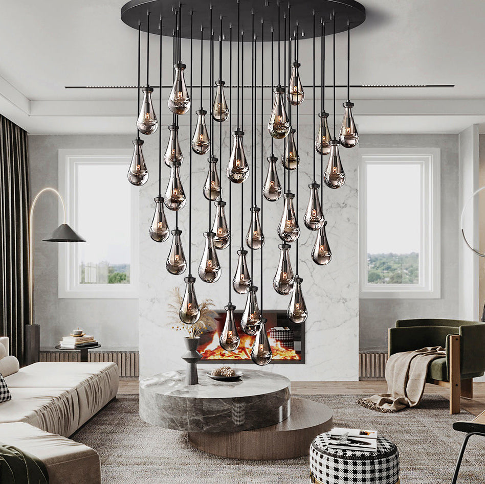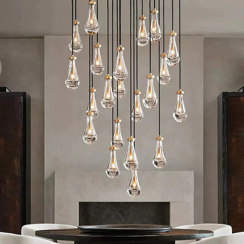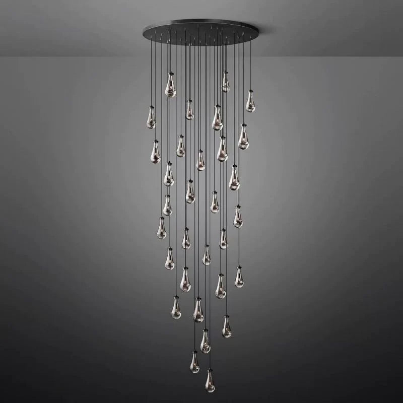 Raindrop Chandelier engages the viewer in an ever-changing pattern of expansion and compression - much like the rhythm of a rainstorm itself. Suspended on slender black ropes, blown glass drops wrap around the bulbs - creating the illusion of underwater illumination - and cast glowing ripples that wash over the ceiling and walls.