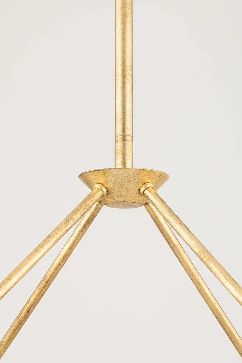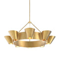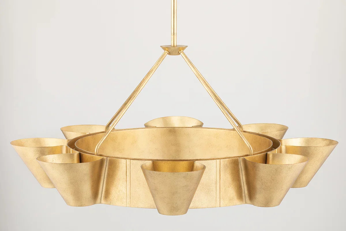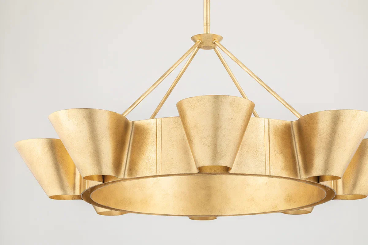 Crafted of gold leaf both inside and out, this fixture casts a golden glow all on its own—before a switch is even flipped. Hand applied, the vintage gold leaf is more subtle giving the piece a natural aged patina. Light pours from the martini glass-shaped shades from above and below providing both direct and bounce lighting. fixture comes in a single-light sconce, eight-light chandelier and eight-lamp linear.