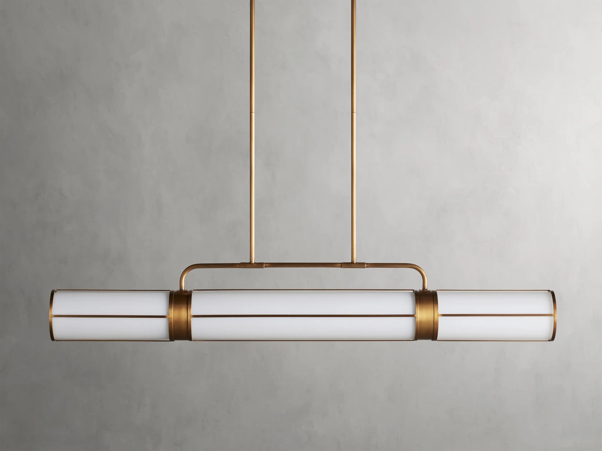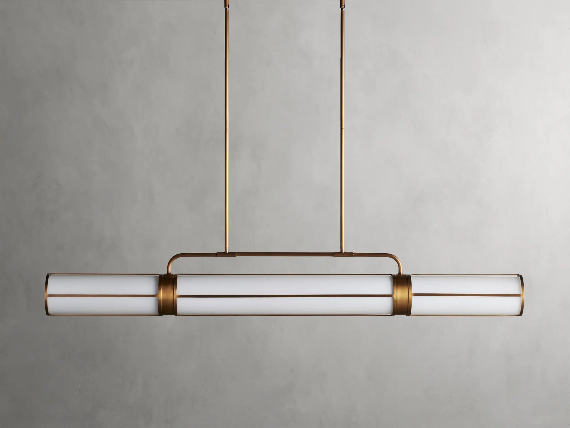Modern sophistication ideal for dining tables and kitchen islands—our exclusive Remming Lighting Collection features linear milk glass tubes and contrasting finish details that come together to create an elevated, industrial-chic aesthetic.