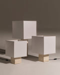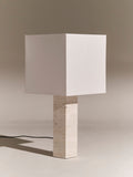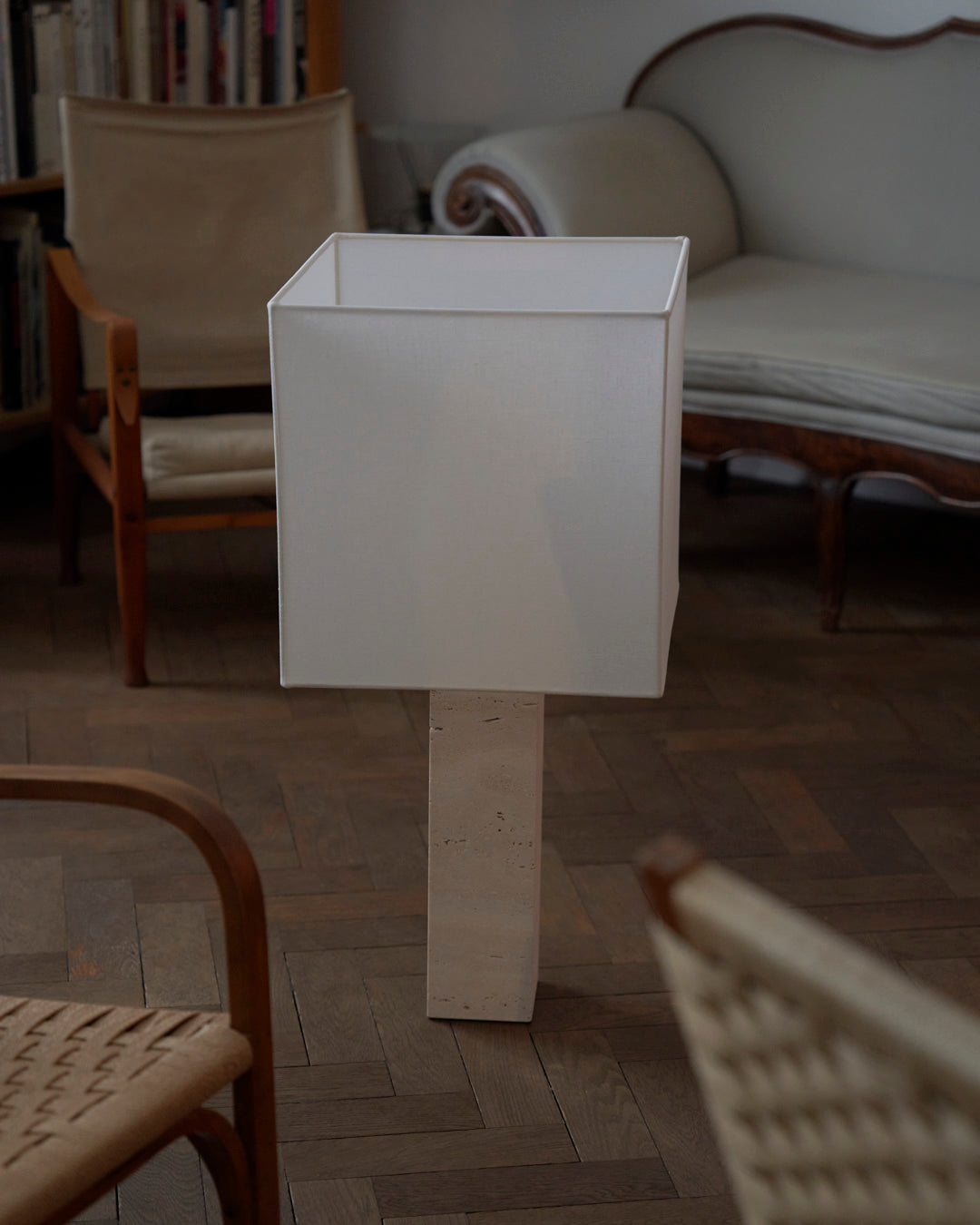 - Materials: Travertine, Linen, Cotton, Brass, Iron