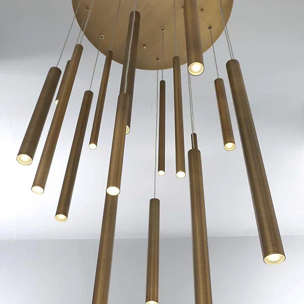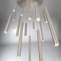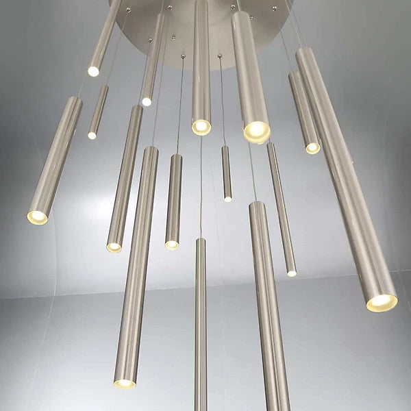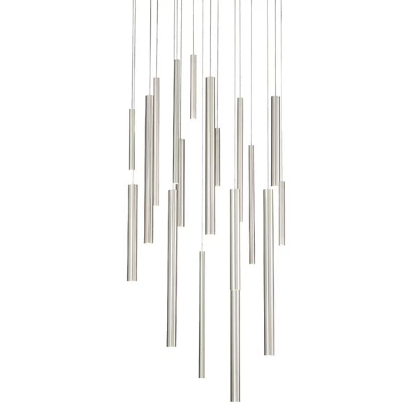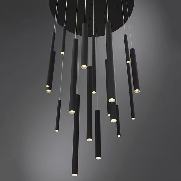 A treat for the eyes. The Santana LED Chandelier from Eurofase creates a concert of line and light that'll prove difficult to look away from. Aside from suspending the design, a circular canopy anchors the piece visually, appearing like a portal for the cascading tubes. Adjustable individually, extruded metal tubes create an encompassing composition; they present stunning visuals when directly underneath it or when seen from across the room. LEDs at the end of the tubes work in conjunction to produce a spirited down glow.