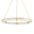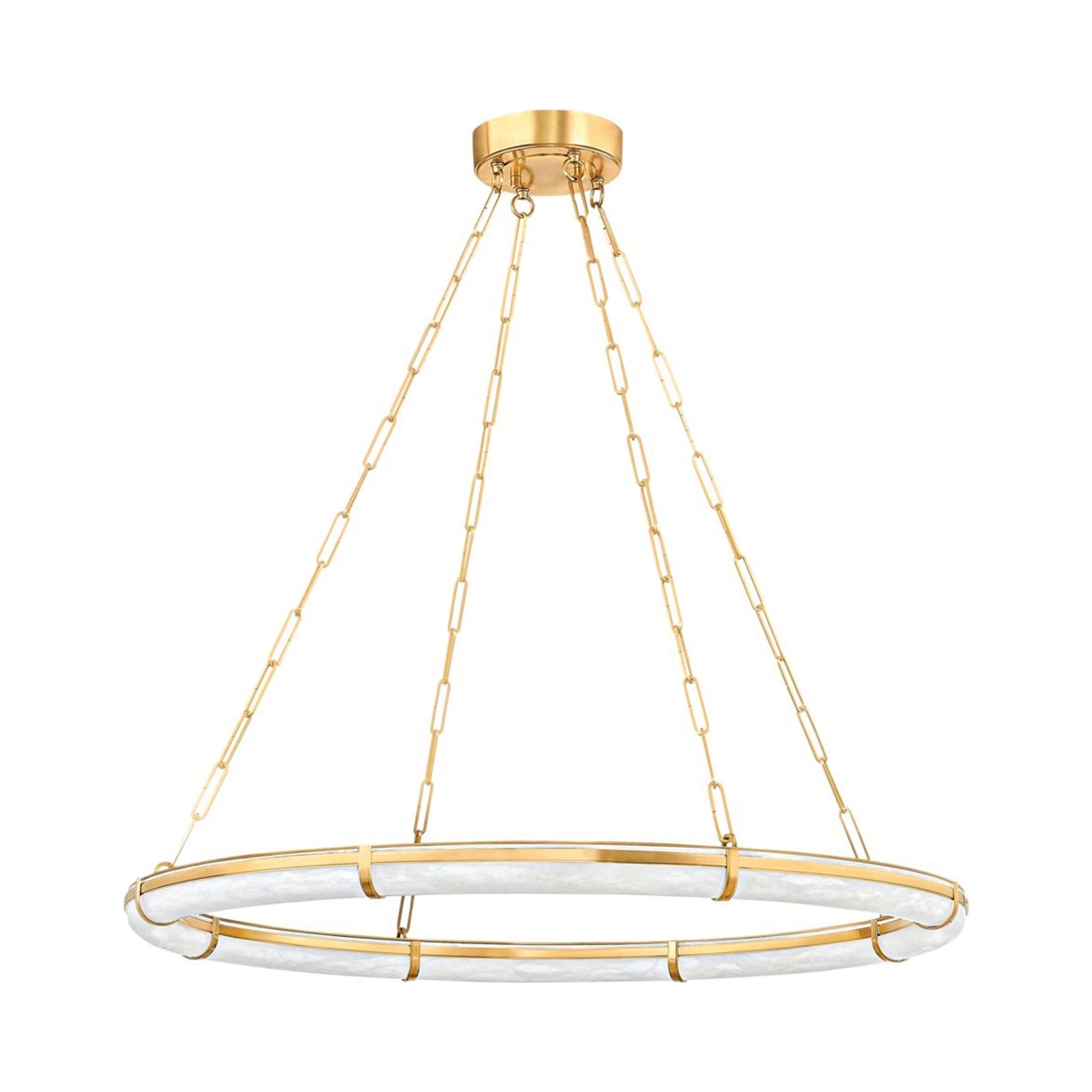 Slender shaping offers diminutive yet powerful style conceptualization with an Art Deco feel as the Sennett LED Chandelier from Hudson Valley Lighting perfects the art of lighting. Its ring-like open shade fashioned of alabaster receives evenly spaced aged brass metal accenting in banding and a circular top, adding a radiant quality to energy-efficient lighting over a dining ensemble or in a foyer. Count on authentic markings and veining from its natural stone shade, and embrace the balanced silhouette of a tri-part chain link suspension.