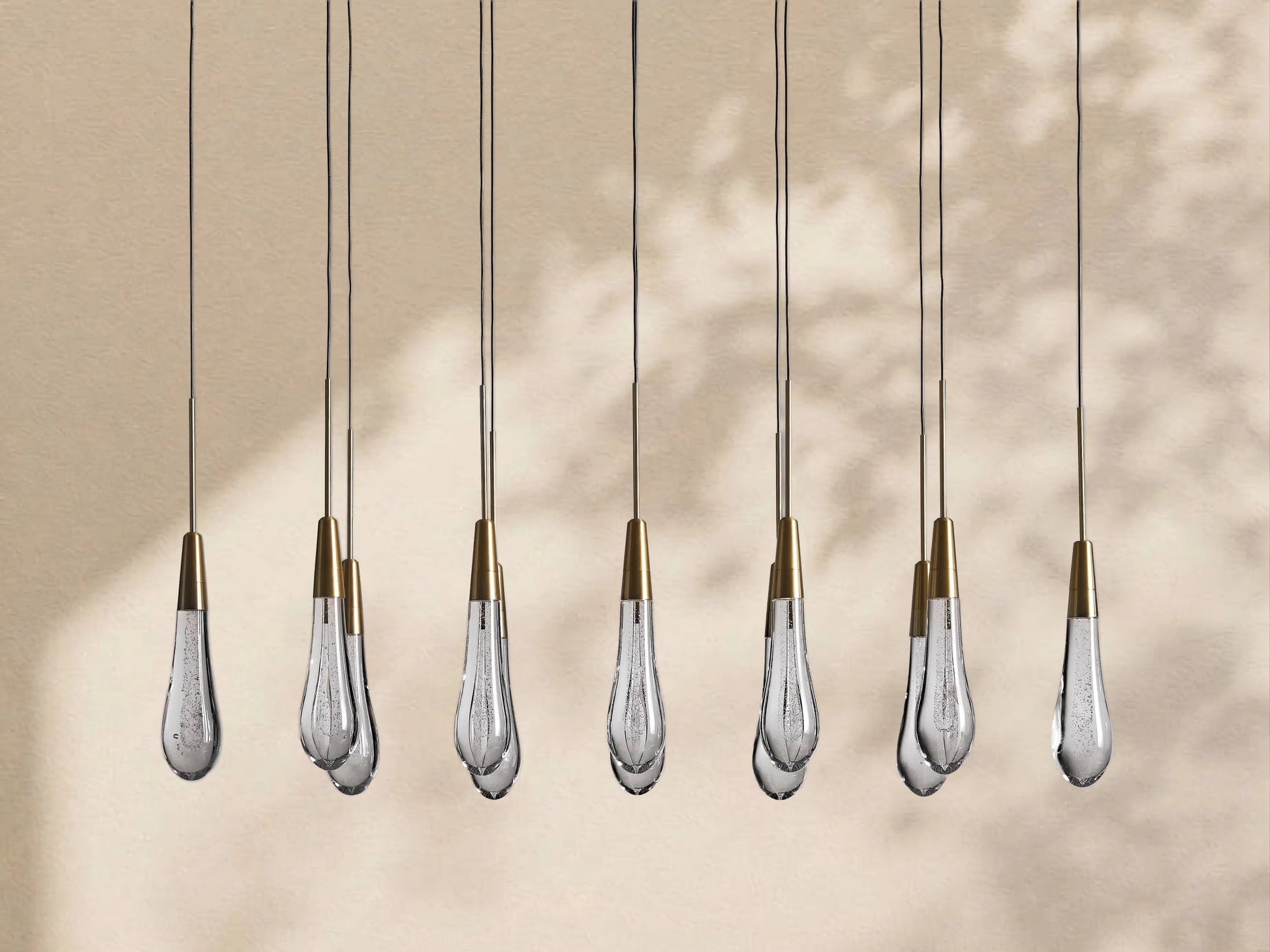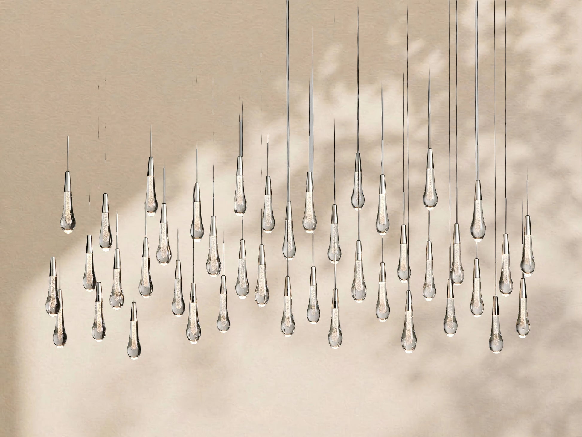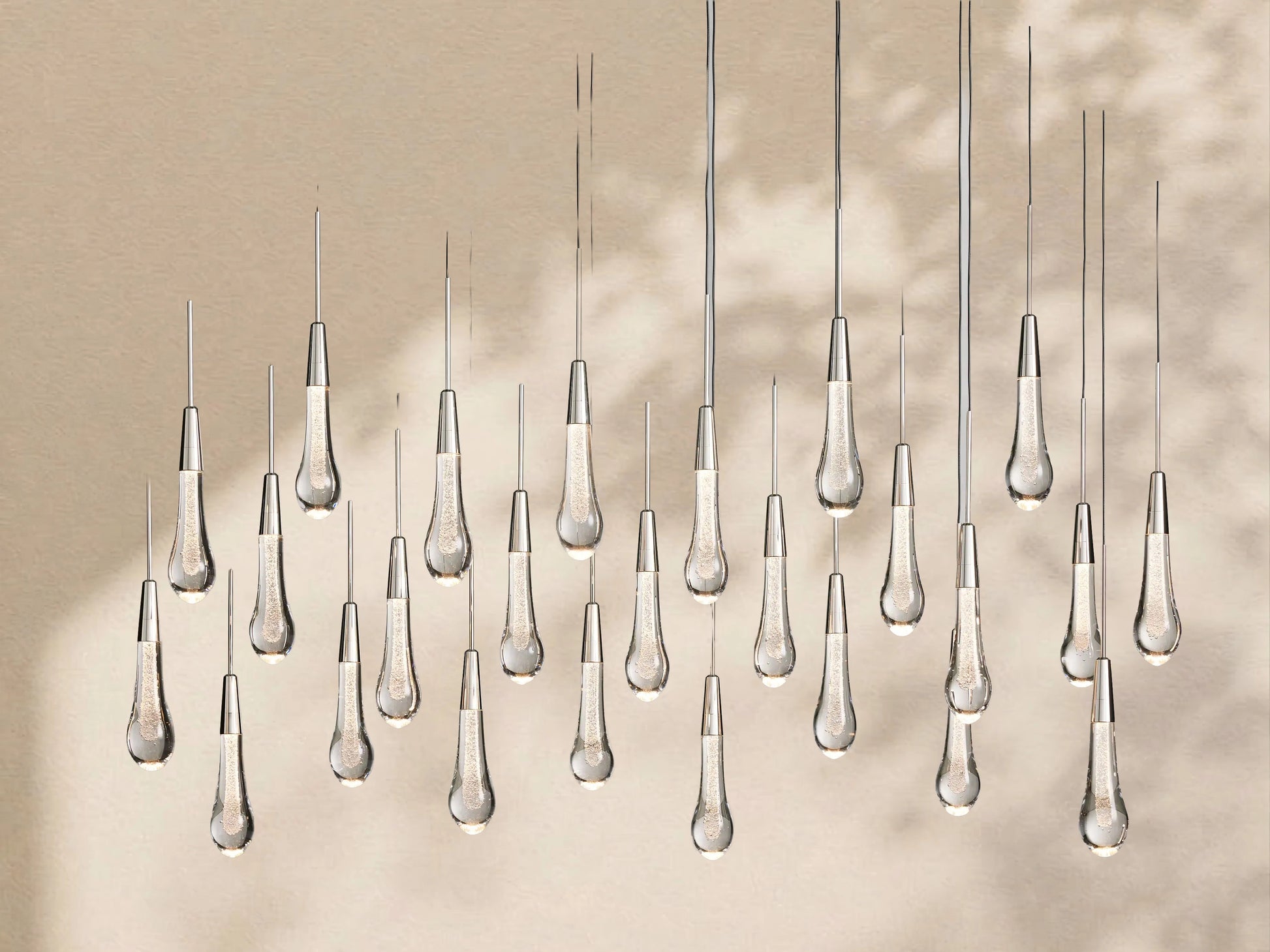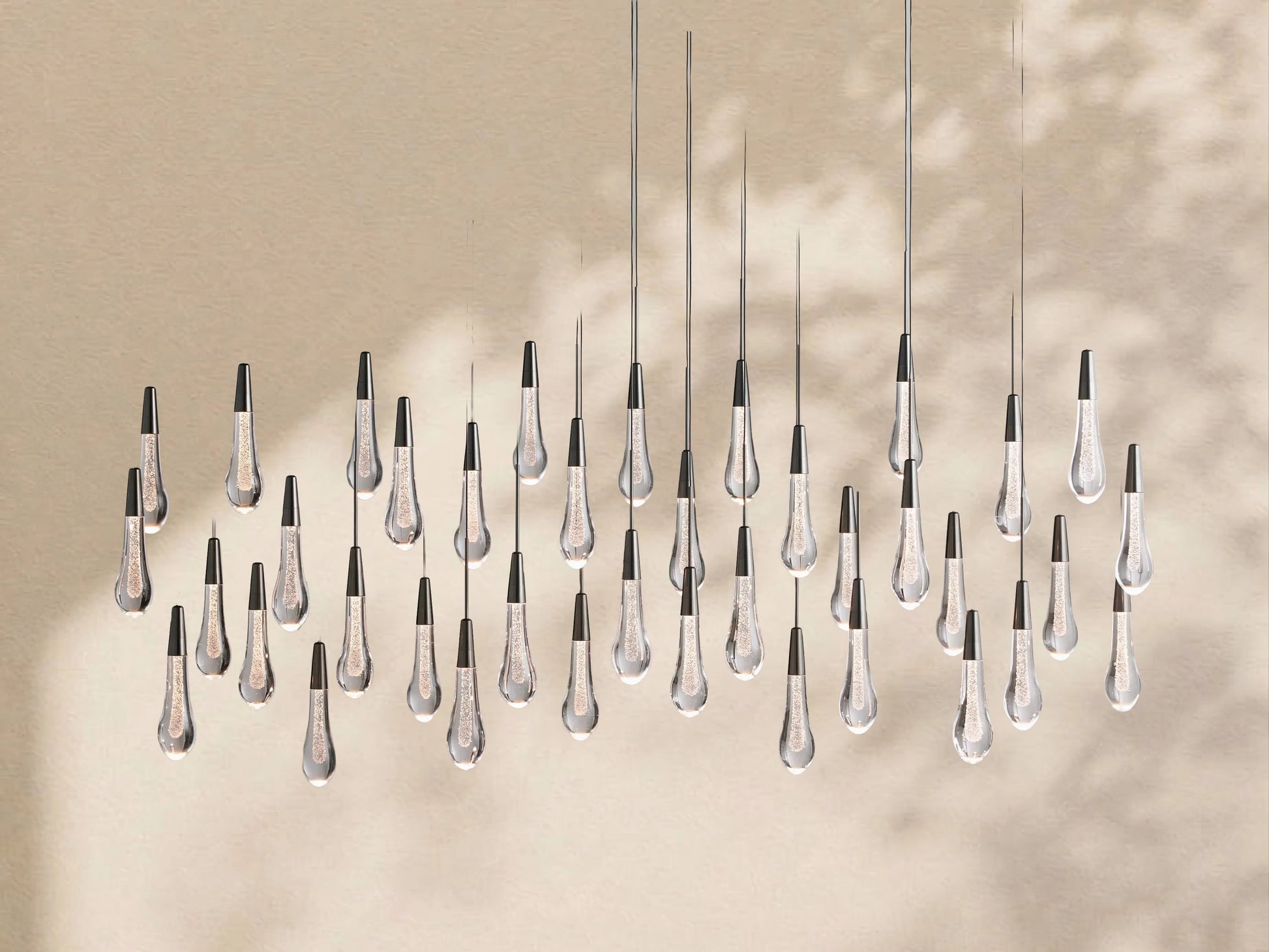 Featuring an adjustable black PVC cord layered with integrated LED lights handcrafted from seeded glass to mimic the look of falling raindrops, our Solotaire lighting collection features a raindrop design that brings a sense of artistry and sophistication to your home. Its elegant styling and sophisticated lighting effects create a luxurious ambiance, adding a touch of high-end style to any space.