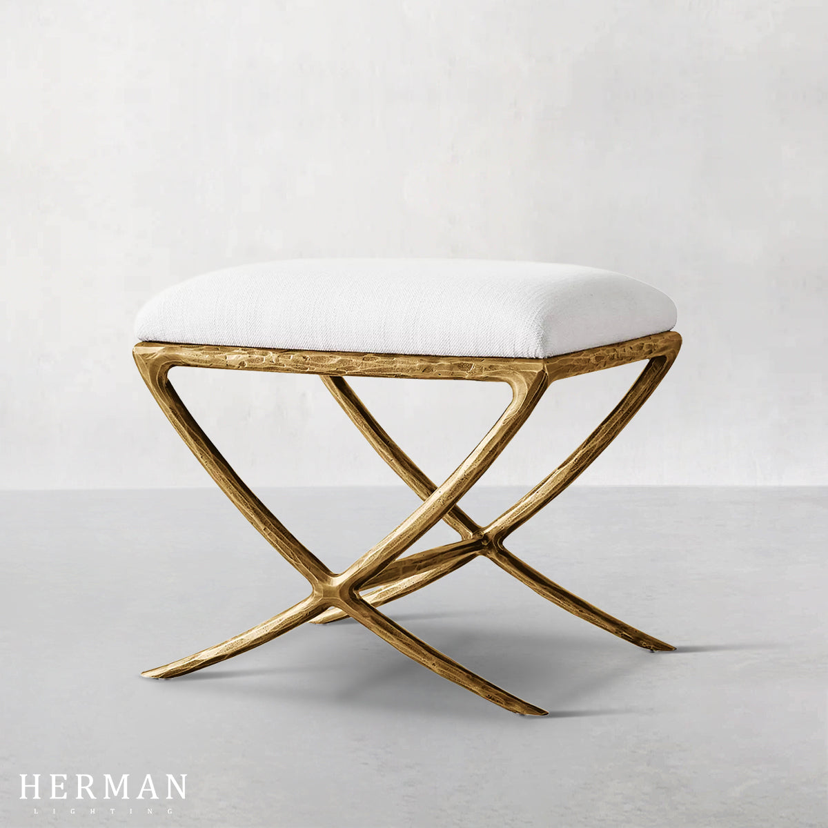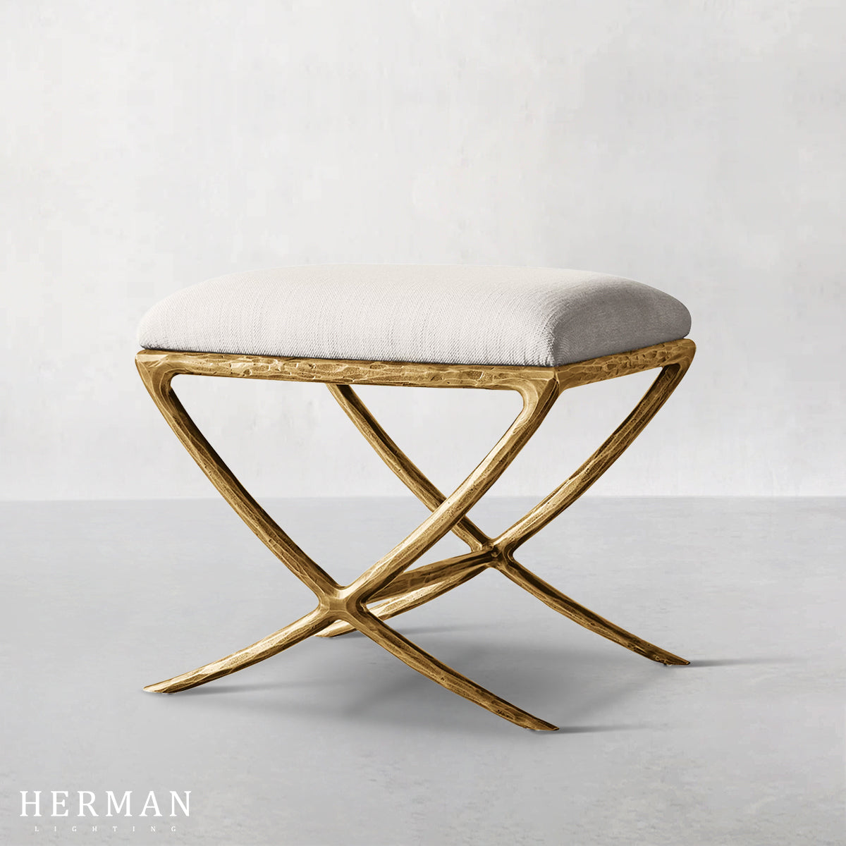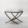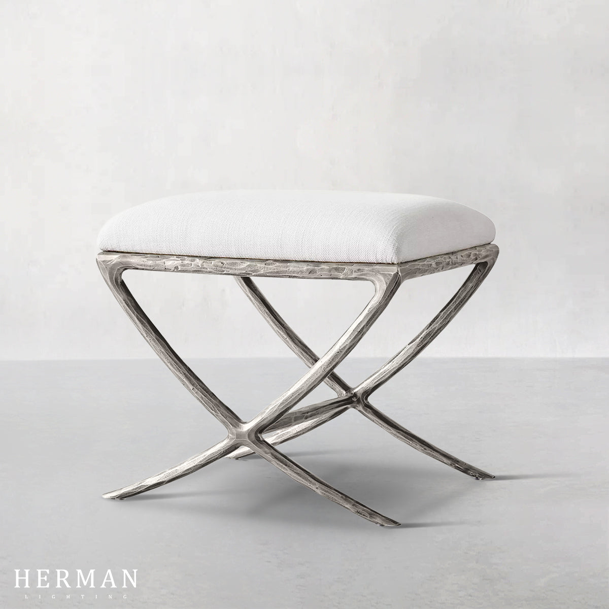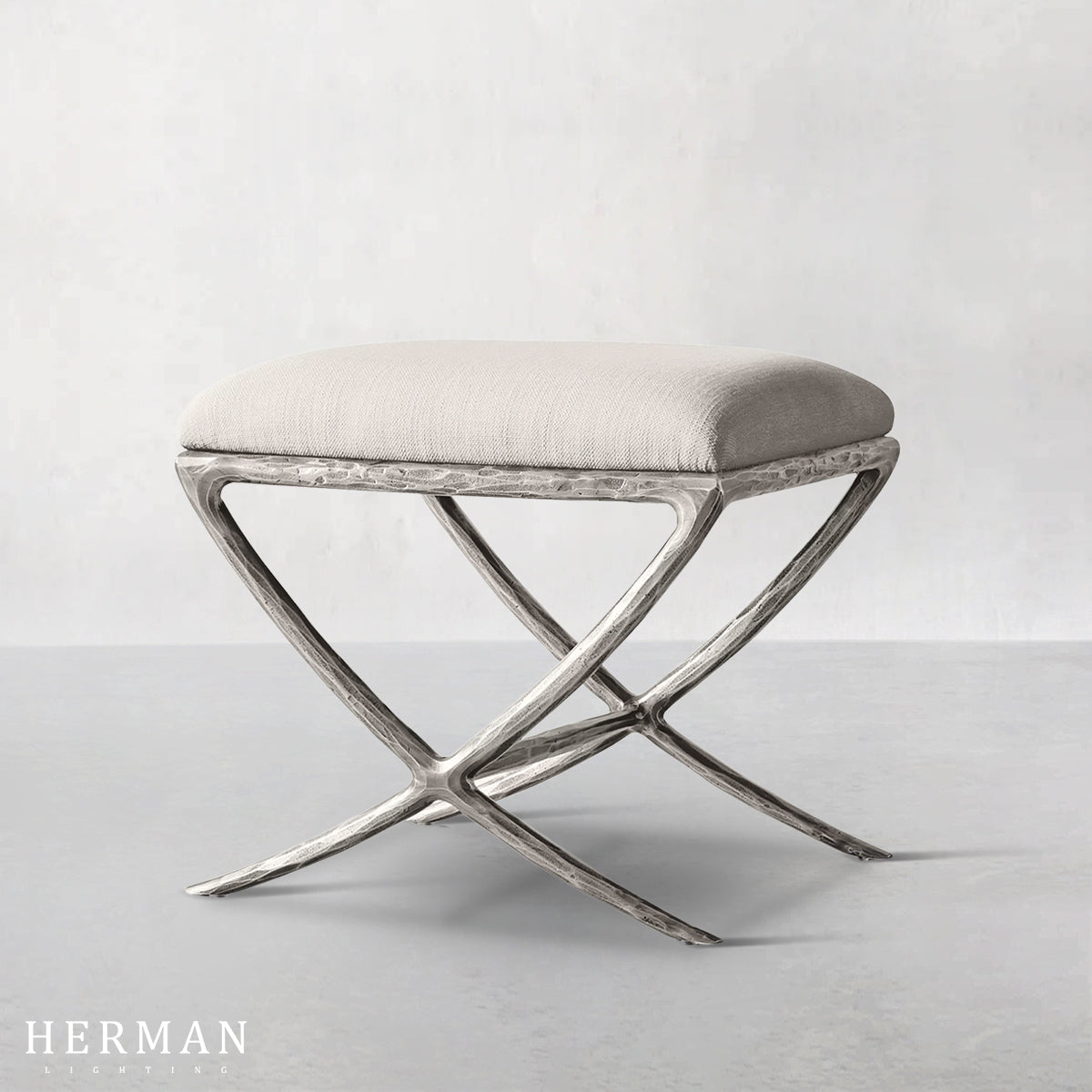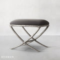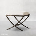 Inspired by the sculptural works of Salvador Dalí and Diego Giacometti, our stool from Alexander merges the rustic sensibility of a hand-forged metal base with tailored upholstery. Employing an ancient fabrication process, artisans hand hammer the metal bars to reveal an alive, imperfect and organic texture, a counterpoint to the frame's slender, tapered silhouette.