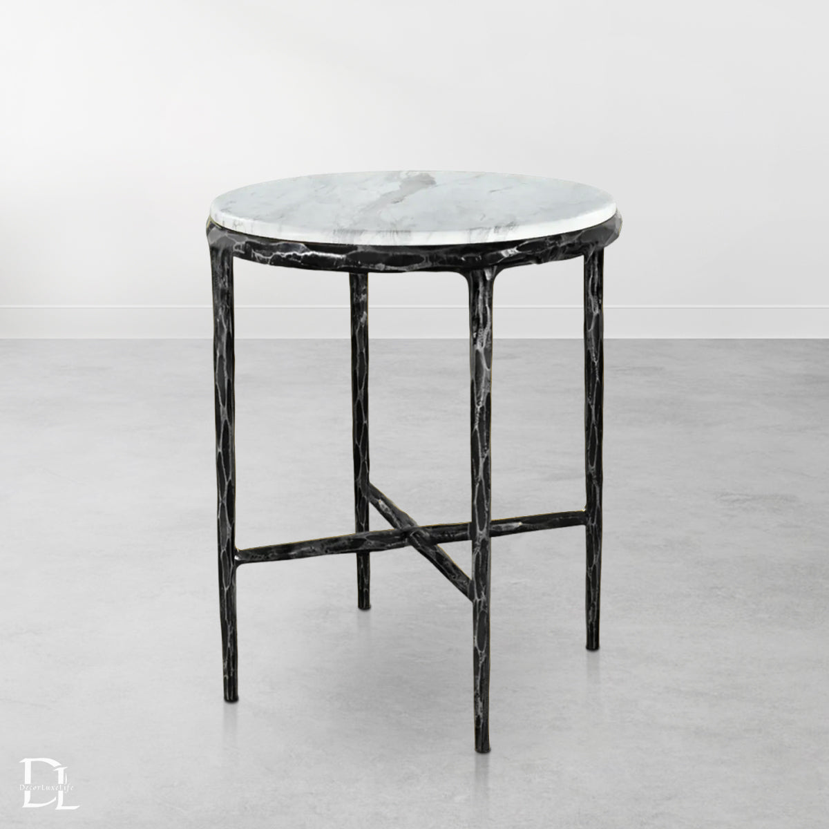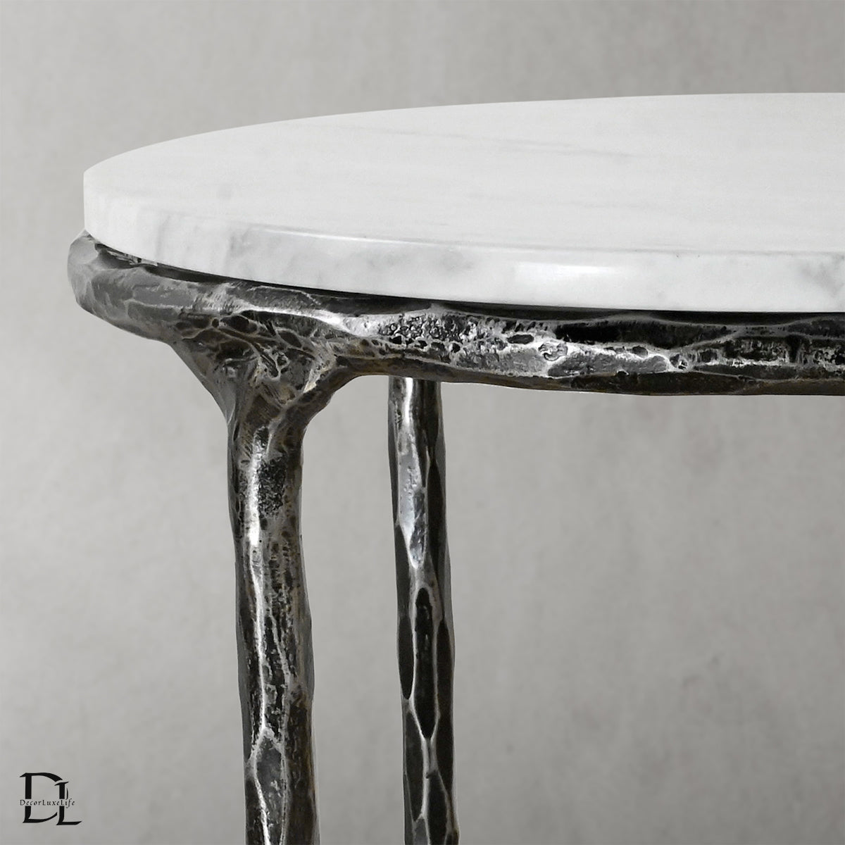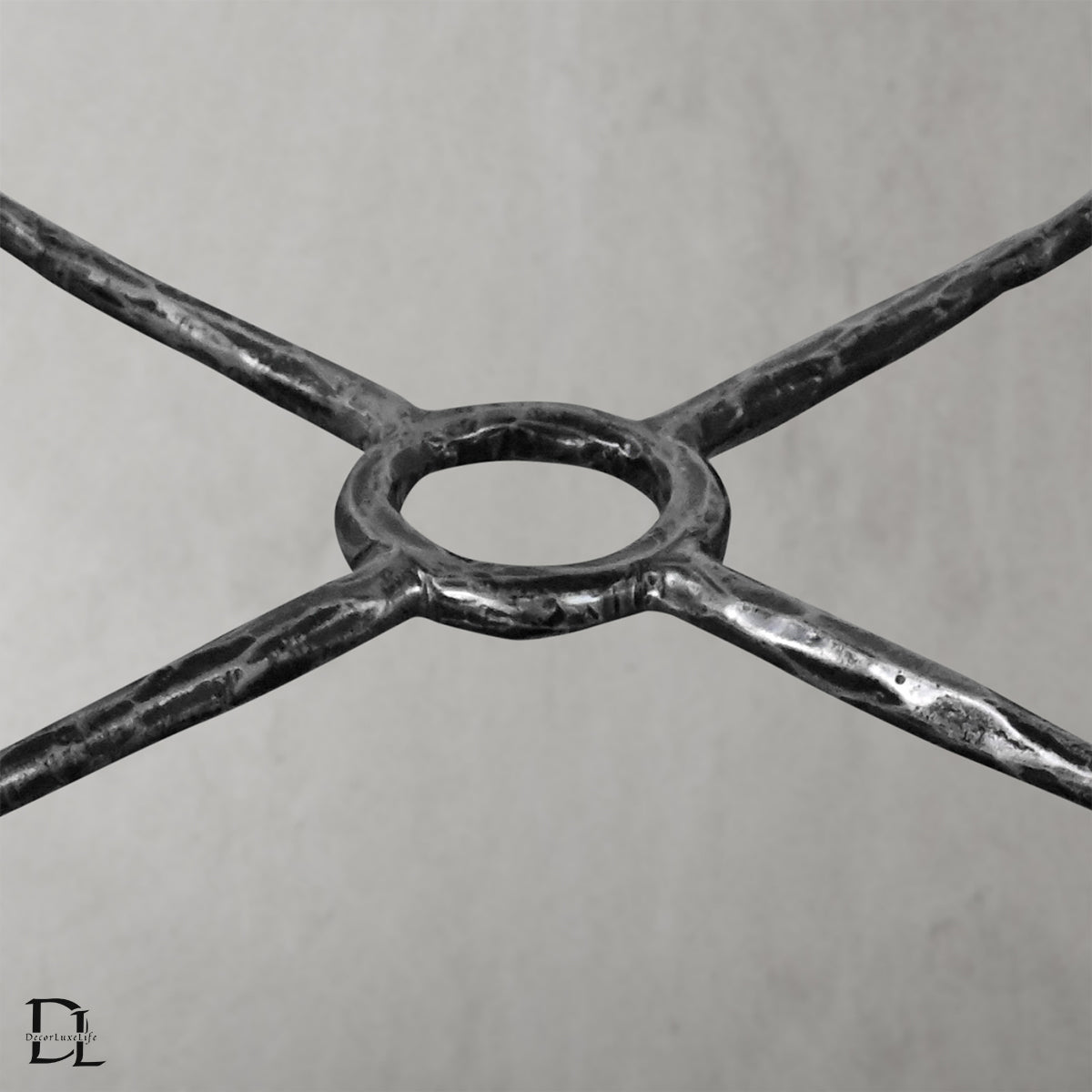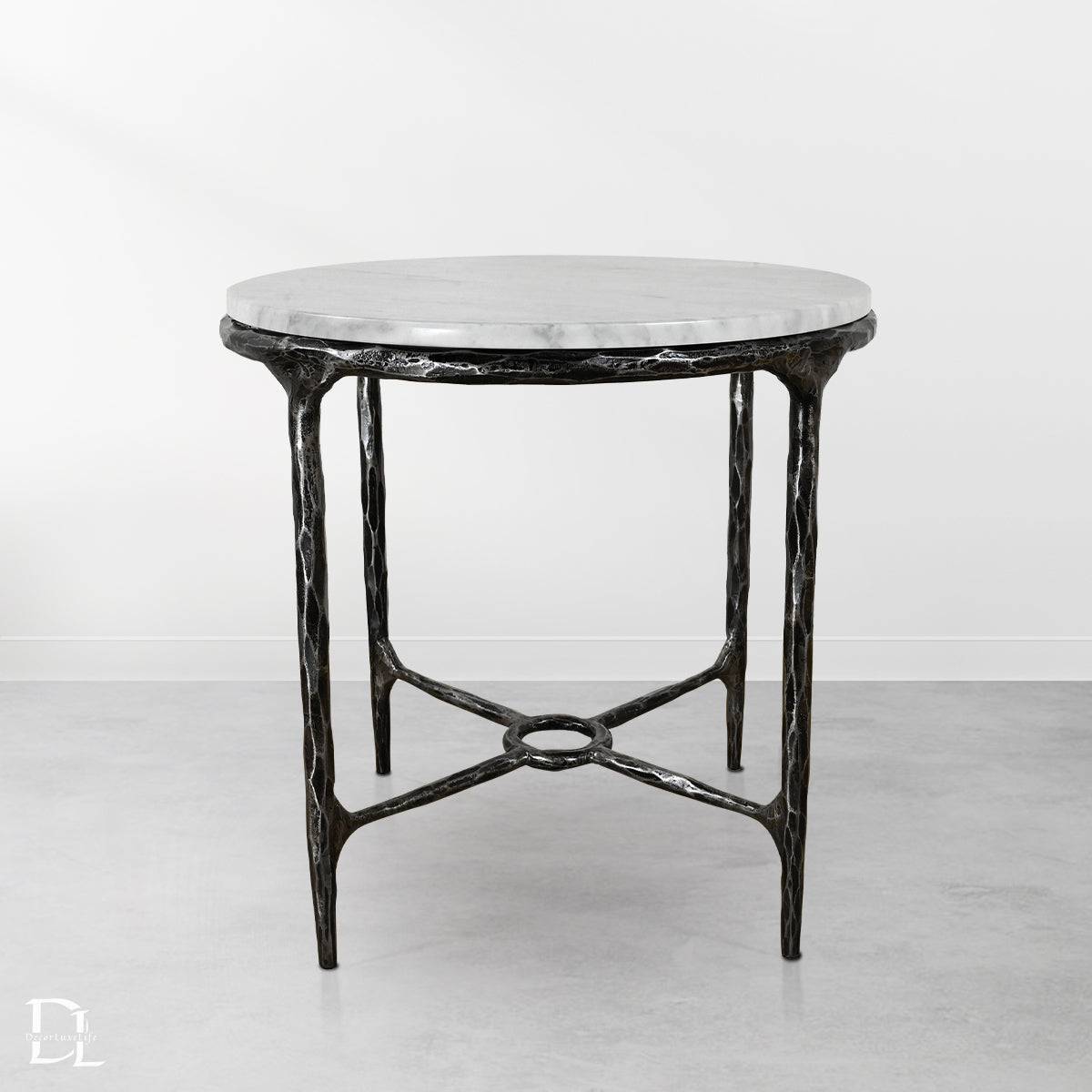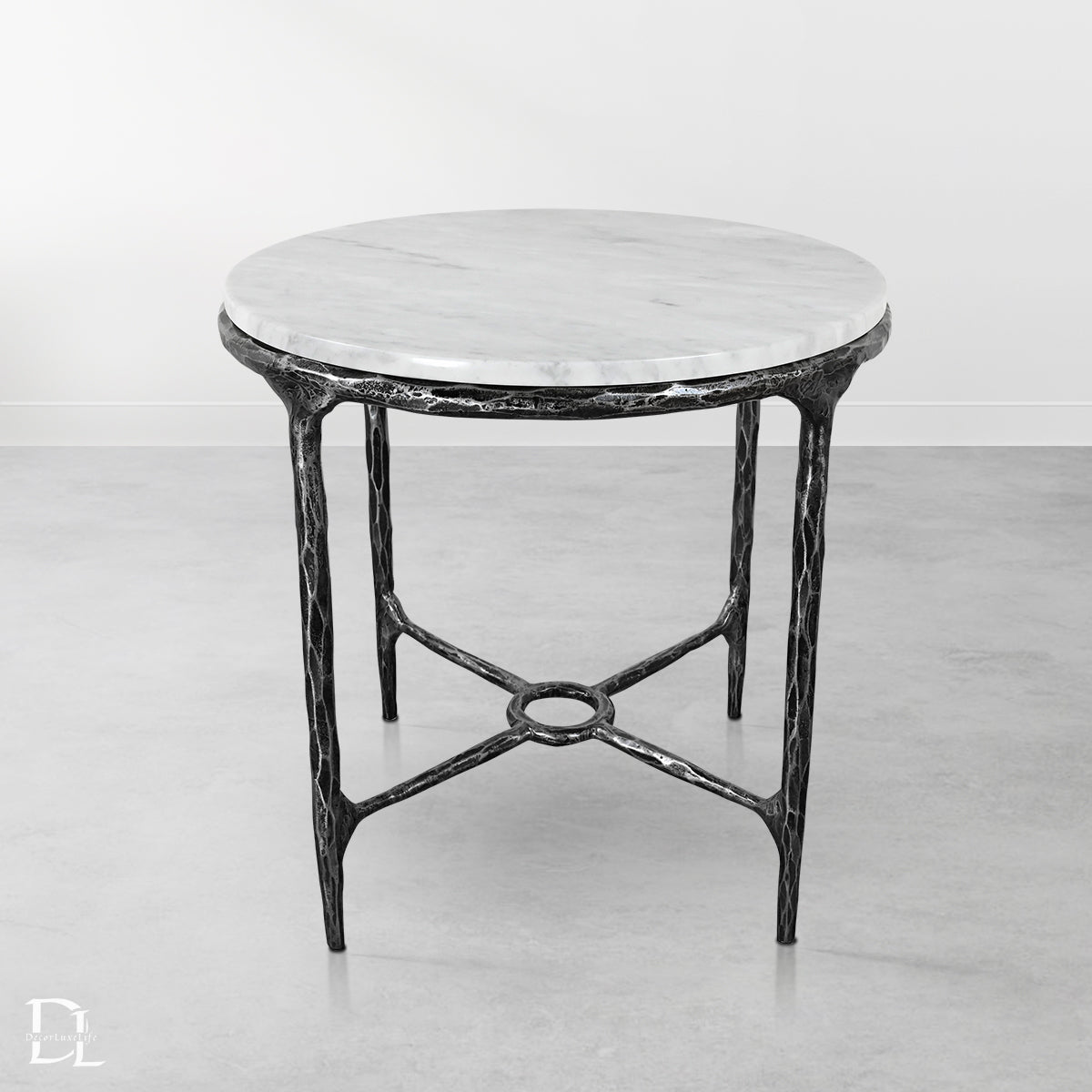 Our collection by the rustic sensibility of hand-forged metal with cool Italian Carrara marble. It can also change to glass top.Employing an ancient fabrication process, artisans hand hammer the metal bars to reveal an alive, imperfect and organic texture. The pounded, tapered silhouettes are a rich counterpoint to the smooth, honed stone.