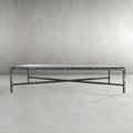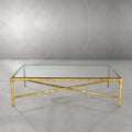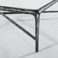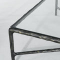 Our collection by the rustic sensibility of a hand-forged metal base with a clear glass top. Employing an ancient fabrication process, artisans hand hammer the metal bars to reveal an alive, imperfect and organic texture, a counterpoint to the frame's slender, tapered silhouette.