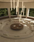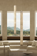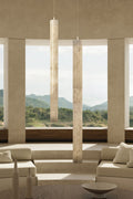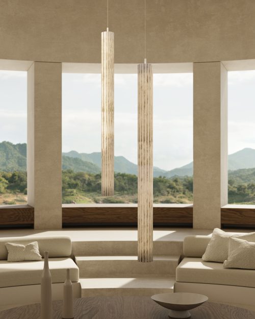 Designed to provide a vertical line of light in spaces such as foyers, reading nooks, decorative arrangements, or transition areas. The result is a cylindrical piece with a fluted section, which adds visual dynamism to the shade and allows for even light diffusion through an elegant alabaster stone.