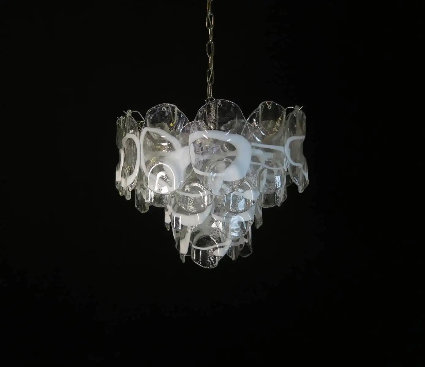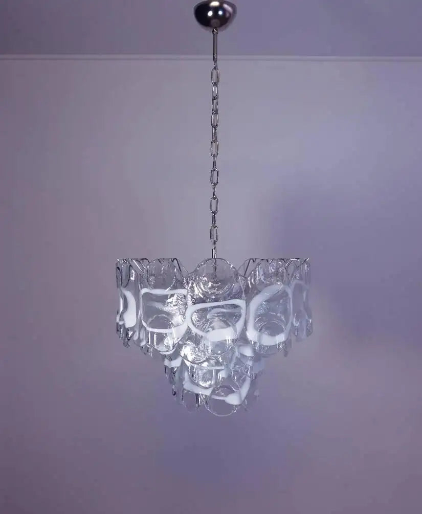 Vintage Italian Murano chandelier in Vistosi style. The chandelier has 36 fantastic Murano white and transparent glasses ("crostoli") in a nickel metal frame.