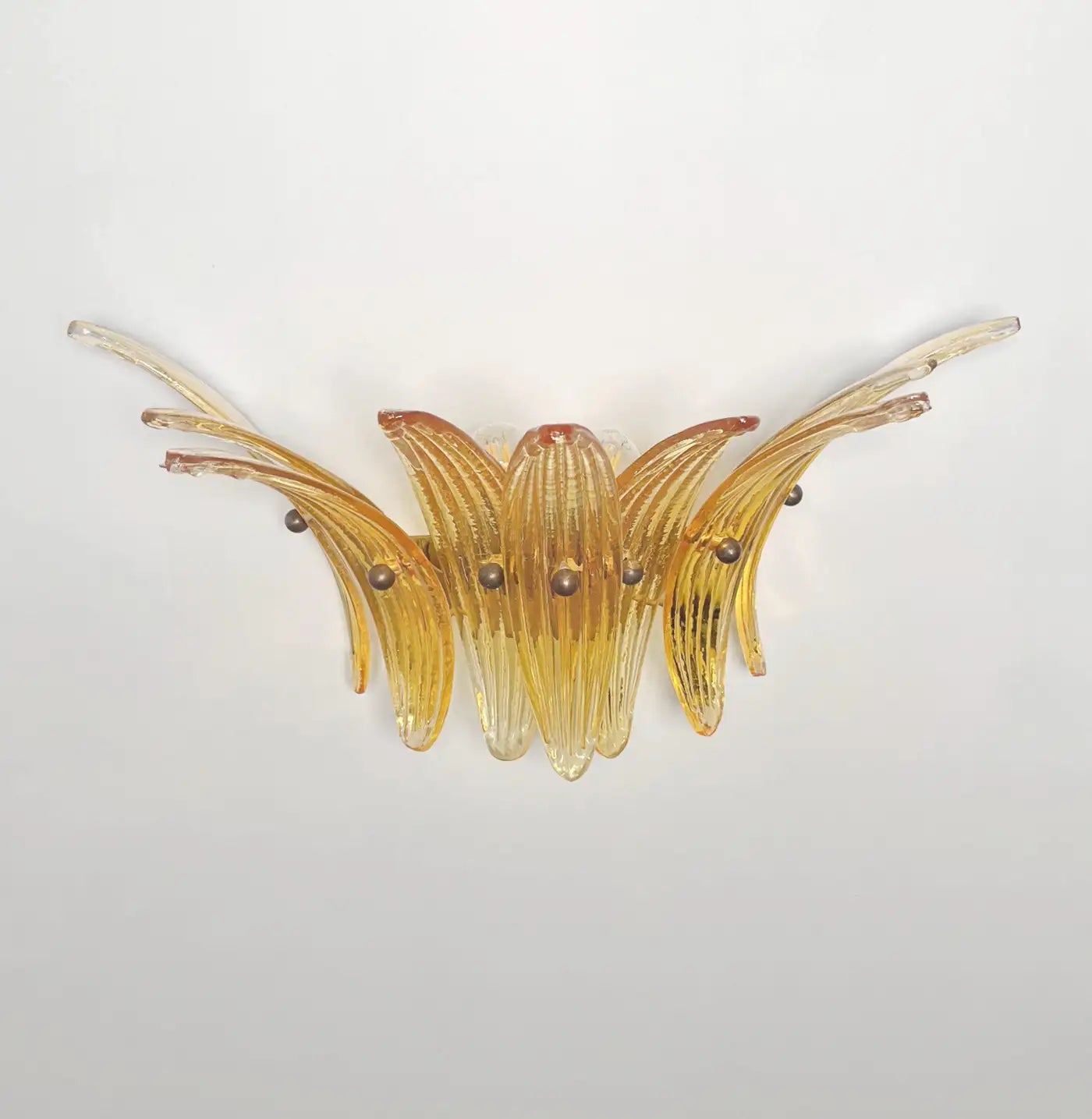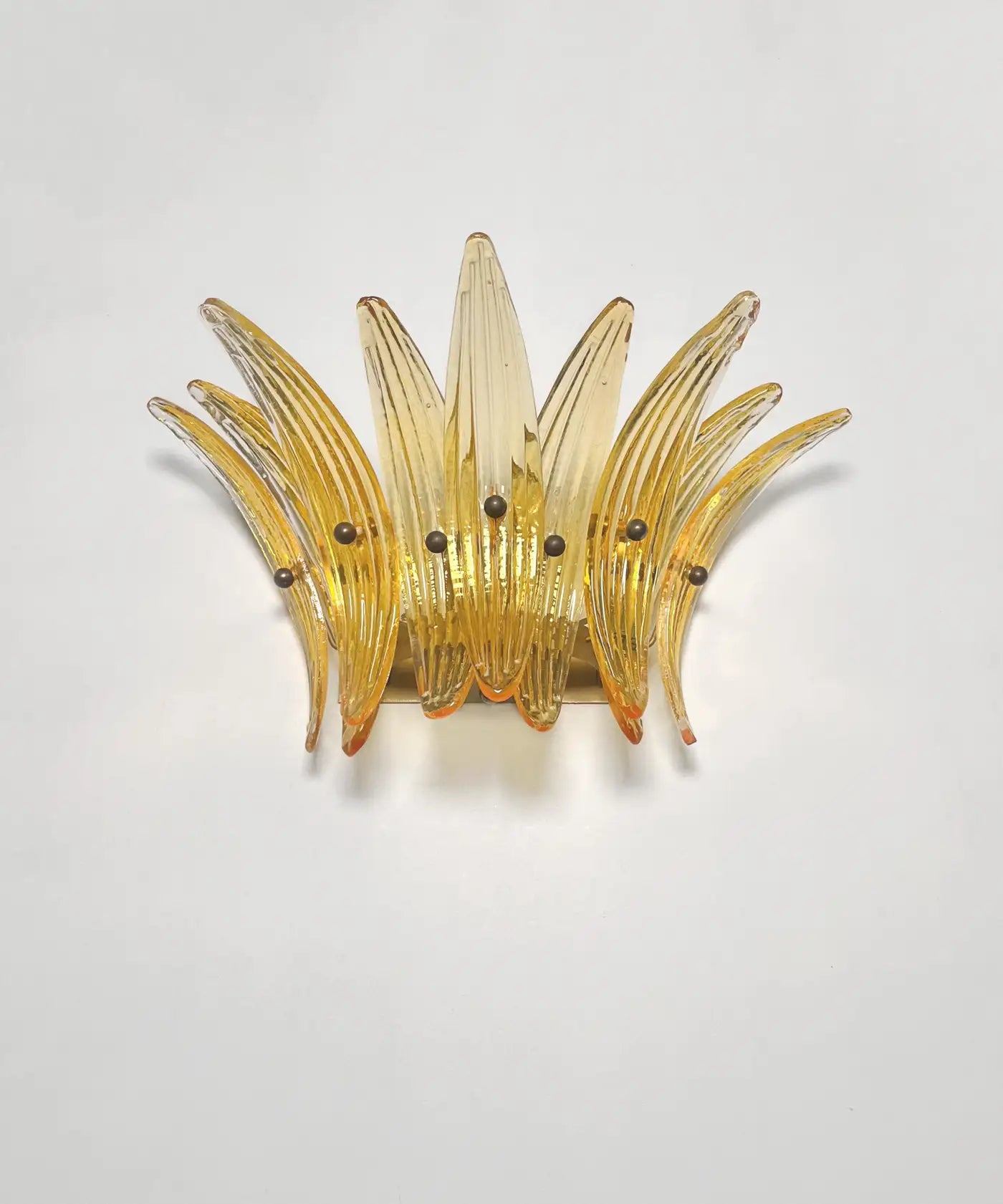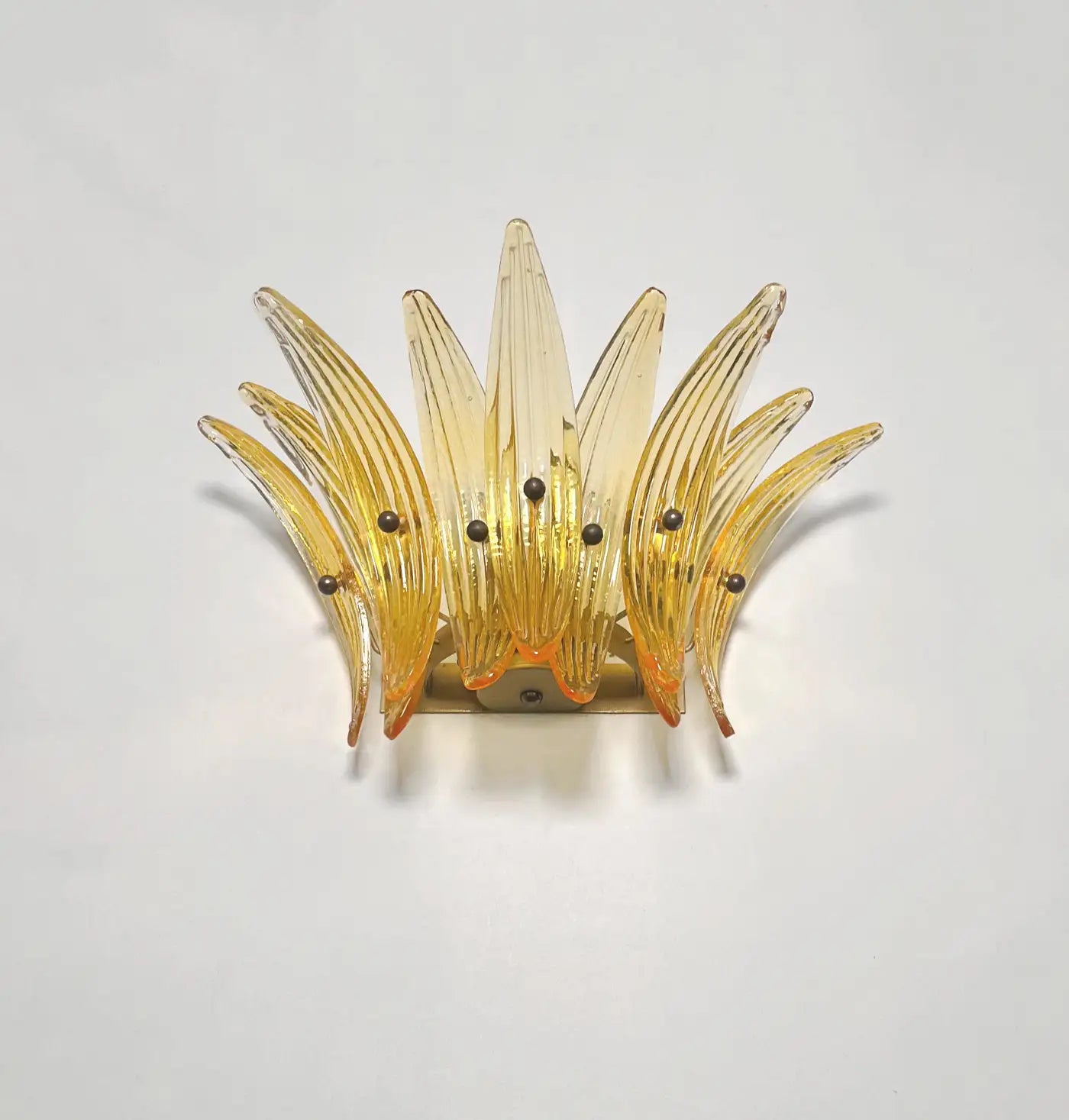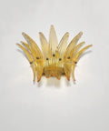 Luxury and GENUINE Murano Glass pair of applique. 100% HAND MADE IN MURANO. The appliques are made by 9 Murano handmade amber palmette glass, for each one, in a Solid metal frame gold painted and brass.