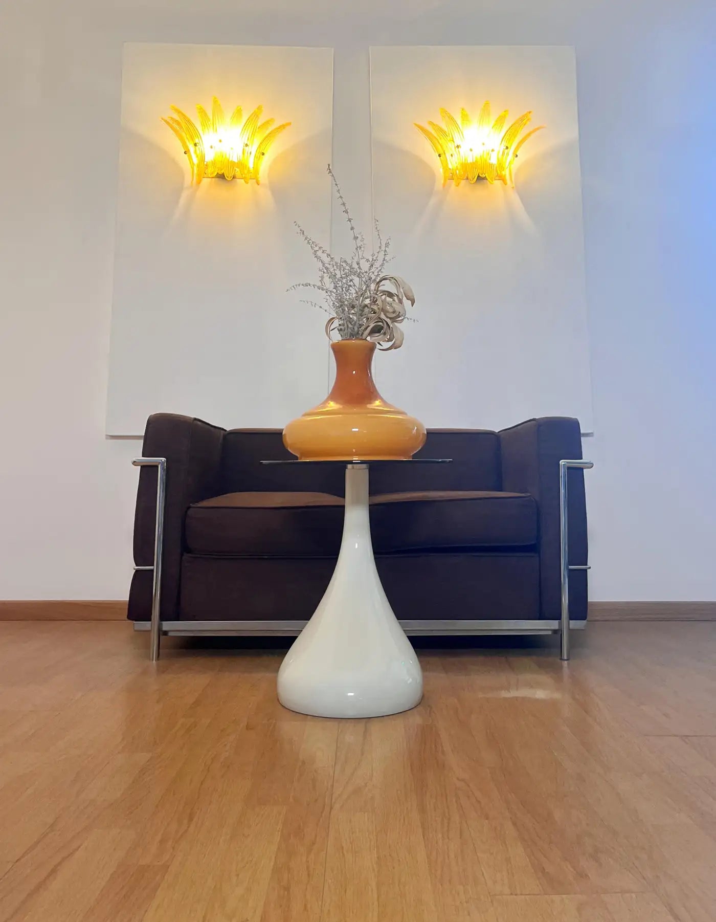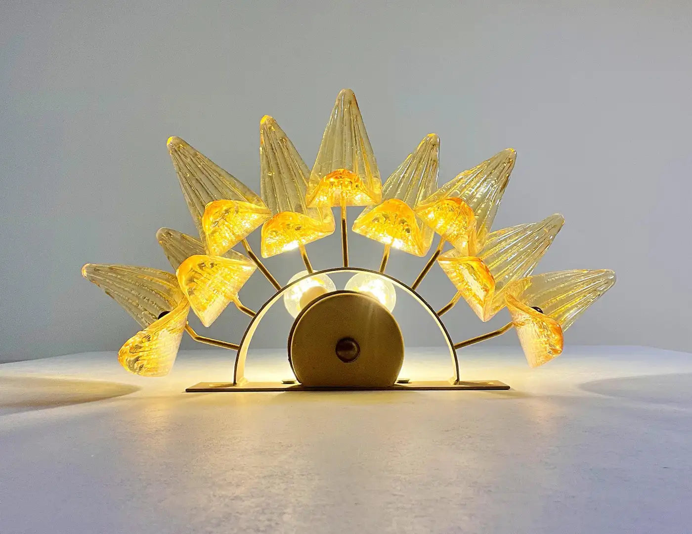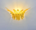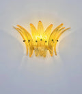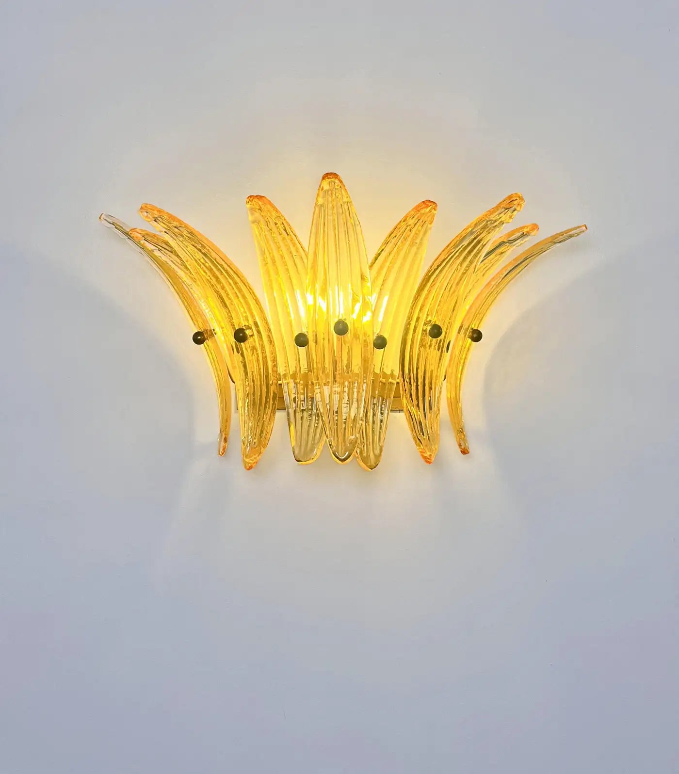 Luxury and GENUINE Murano Glass pair of applique. 100% HAND MADE IN MURANO. The appliques are made by 9 Murano handmade amber palmette glass, for each one, in a Solid metal frame gold painted and brass.