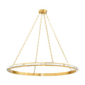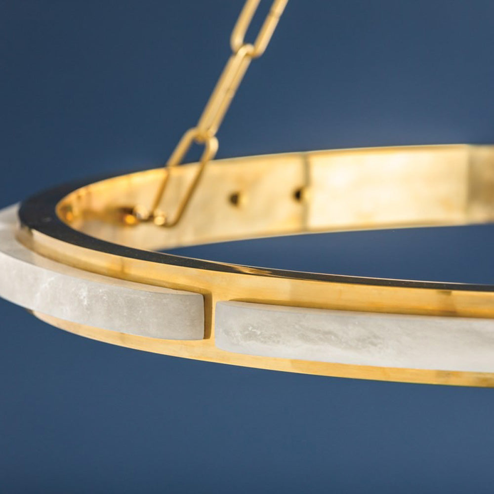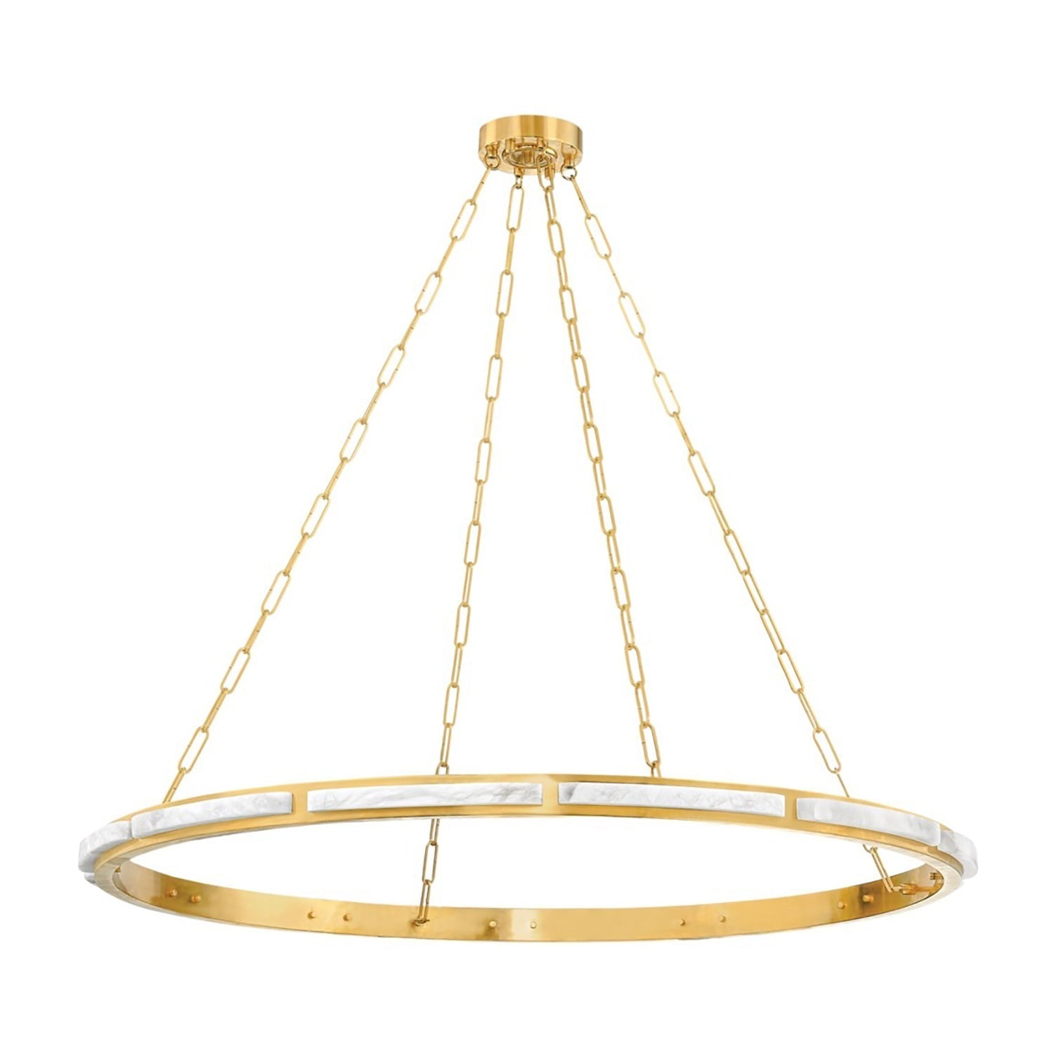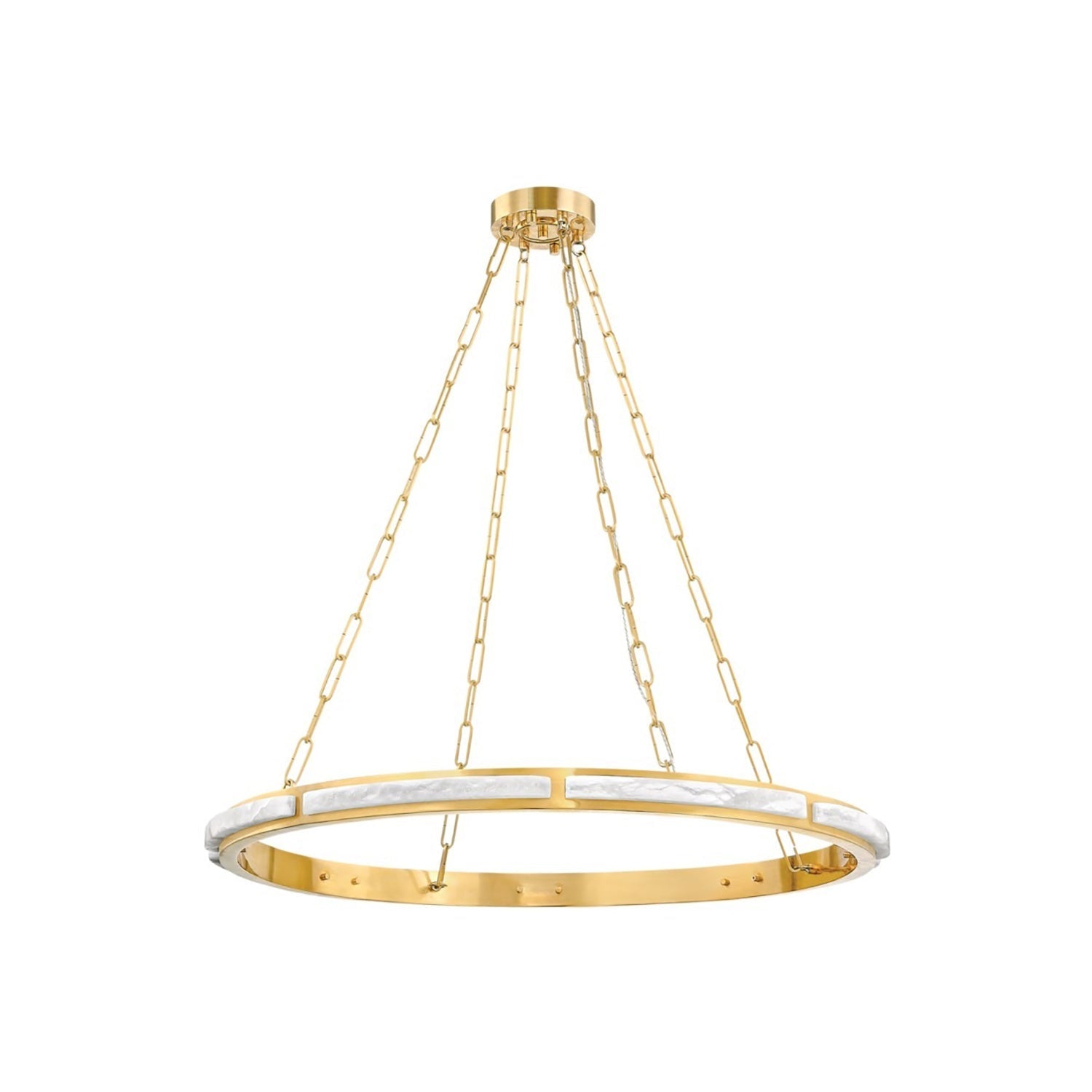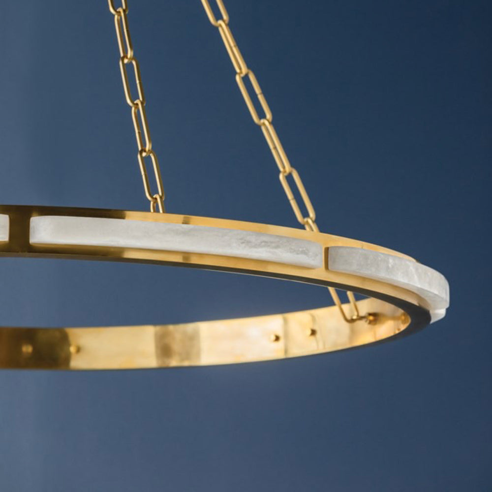 A ring of artisan charm is both elegant and basic as the Wingate LED Chandelier from Hudson Valley Lighting offers a simple circular frame as its base. With sophistication appearing in a balanced profile, this fixture offers decadent alabaster pieces lining its aged brass metal frame, and classic cable link chain suspension. Unmatched versatility takes a page from Art Deco influence to offer an energy-efficient fixture with a statement-making ability.